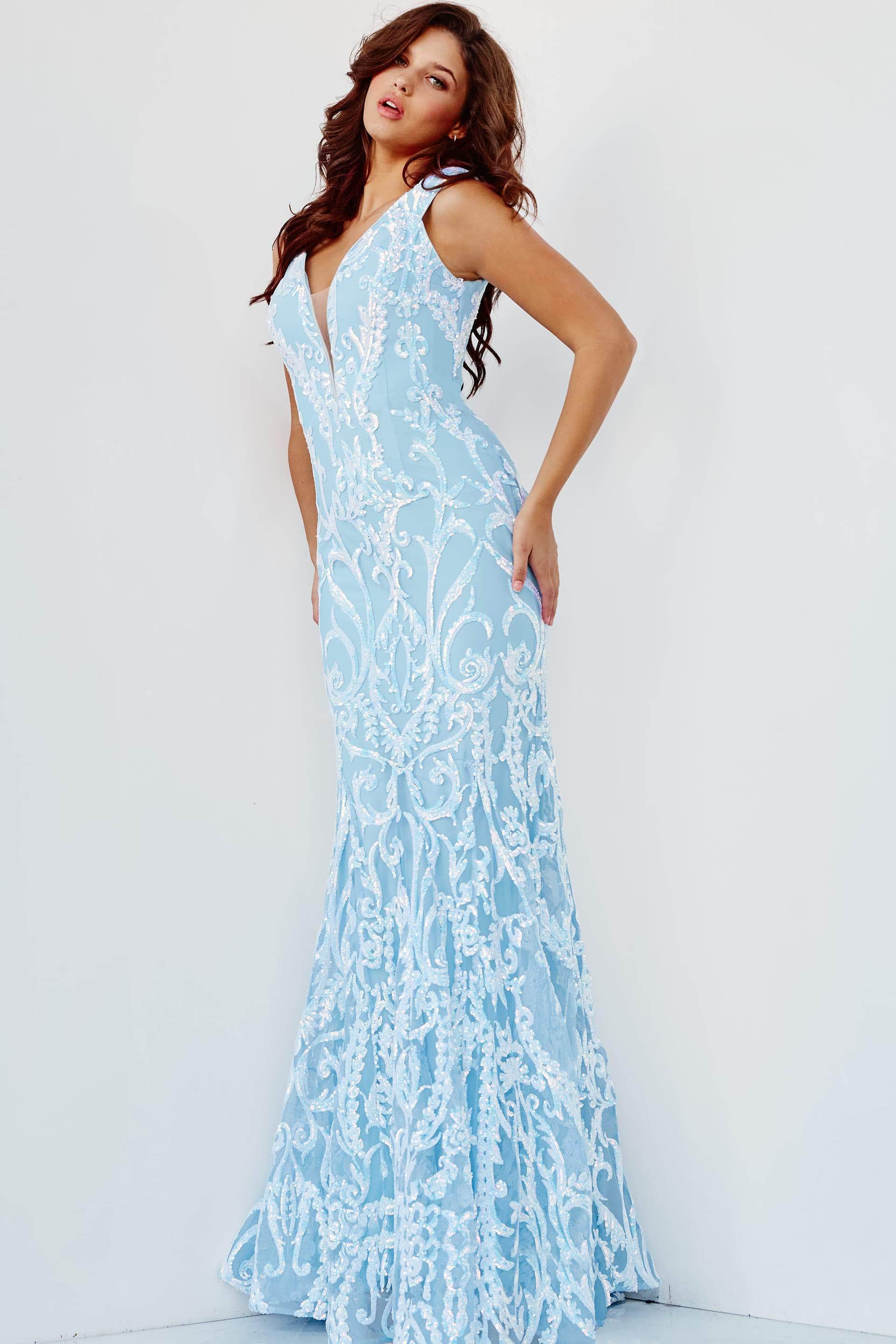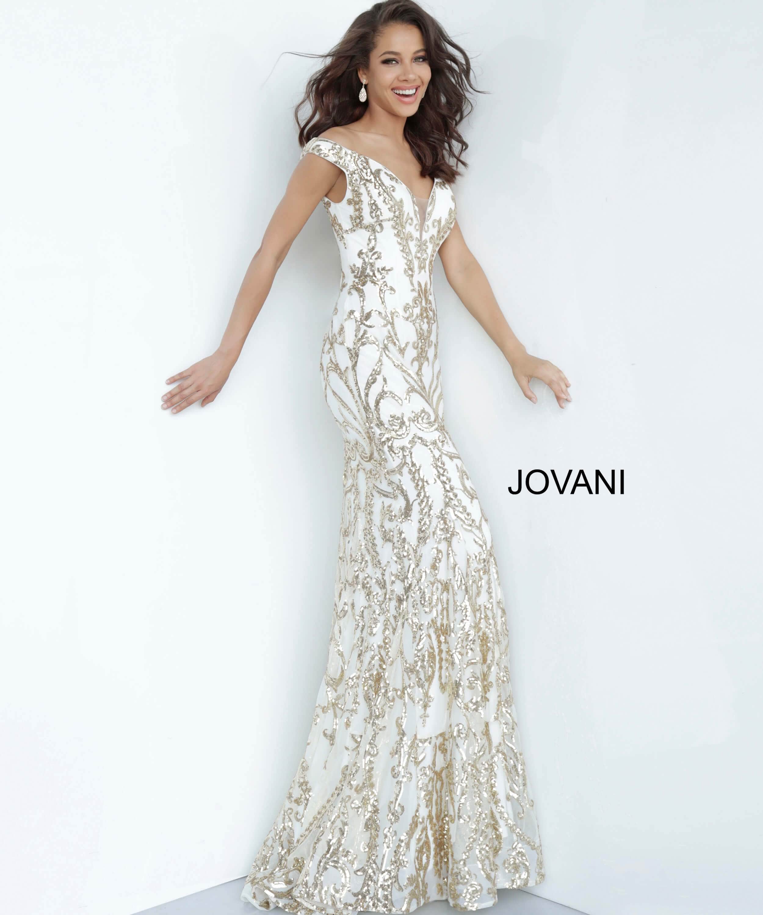 Glow beautifully as you look so fancy in this exceptional Jovani 63349 creation. Elaborately embellished with sequins in an intricate pattern, this chic piece shows an off shoulder neckline with a plunging sweetheart notch and an illusion inset. Sculpted with a mid-open back, the sheath skirt waterfalls down to a gleaming court train. Fantasize no more at being the belle of the ball in this exquisite Jovani masterpiece. Models are wearing Black/Gold, Black/Royal, White/Gold and Light Blue colors..