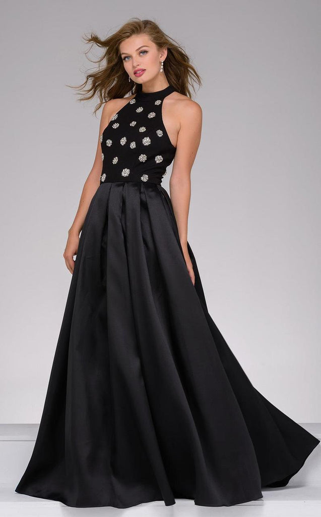 Featuring an arched strap that holds the halter bodice at the throat, and a form-fitting top makes a stunning silhouette. Crystal clusters dot bust and midriff, ensconcing you in shiny glints. Soft pleats charm the satiny skirt, opening to sweeping folds at full-length.