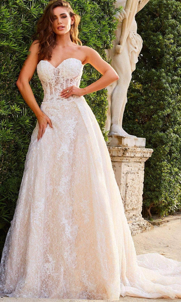 Bask under the shimmering limelight while parading this stunning Jovani Bridal JB05349 creation on your wedding day. Structured with a corset boned bodice and rendered with a gorgeous floral lace overlay, this strapless bridal gown reveals a sweetheart neckline with a sheer midrise back. Opulently layered to perfection, this stunning piece flares sumptuously into an A-line silhouette and a court train. You will truly shine from every angle in this tantalizingly elegant Jovani Bridal JB05349 masterpiece. Model is wearing the Ivory color.