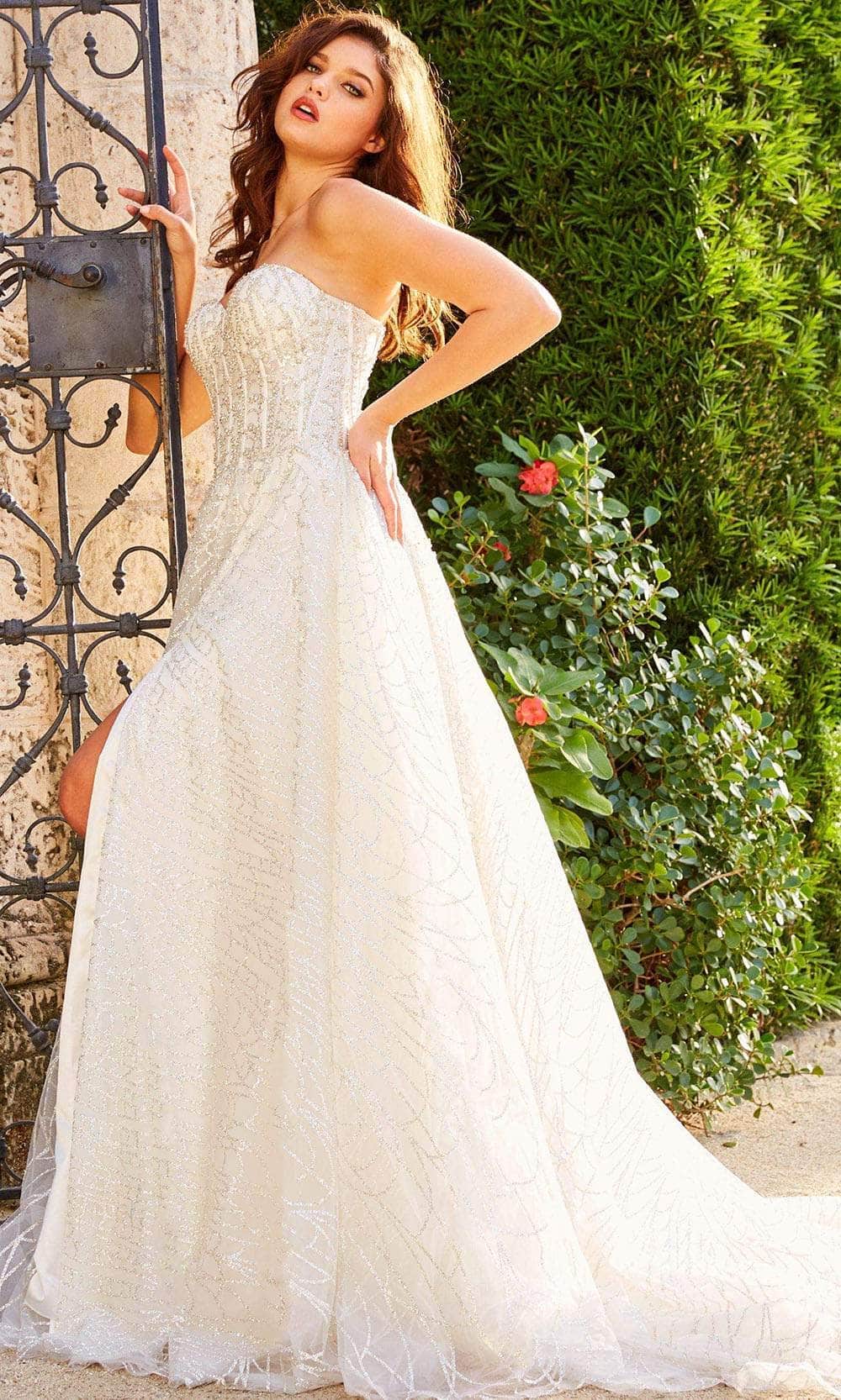 Impart sophisticated eloquence in this exquisitely styled Jovani Bridal JB07578 creation on your wedding day. Designed and sculpted with tailoring lines and structed with corset boning along the bodice, this wedding gown is styled with a strapless form and a sweetheart neckline. Defined beadwork adorning the bodice while flaunting a midrise back, the cracked tulle skirt forms an A-line silhouette graced with a high slit. This sparkly A-line bridal dress is finished with a chapel train. All eyes will be on you on your wedding day in this Jovani Bridal JB07578 masterpiece. Model is wearing the Ivory/Silver color.
