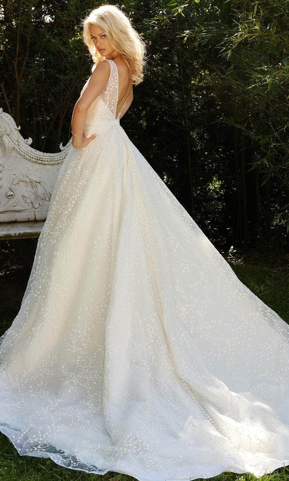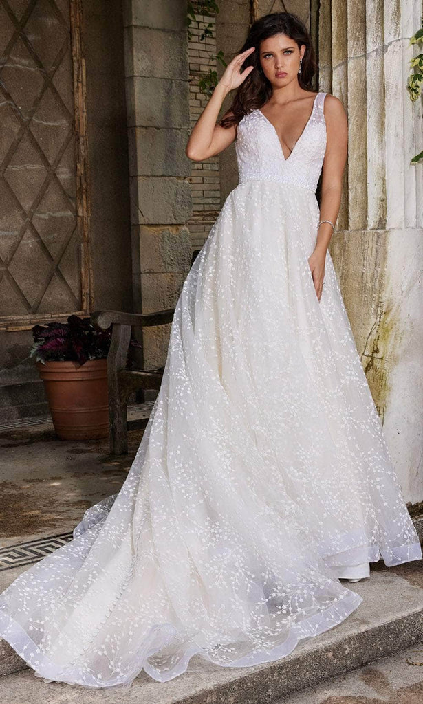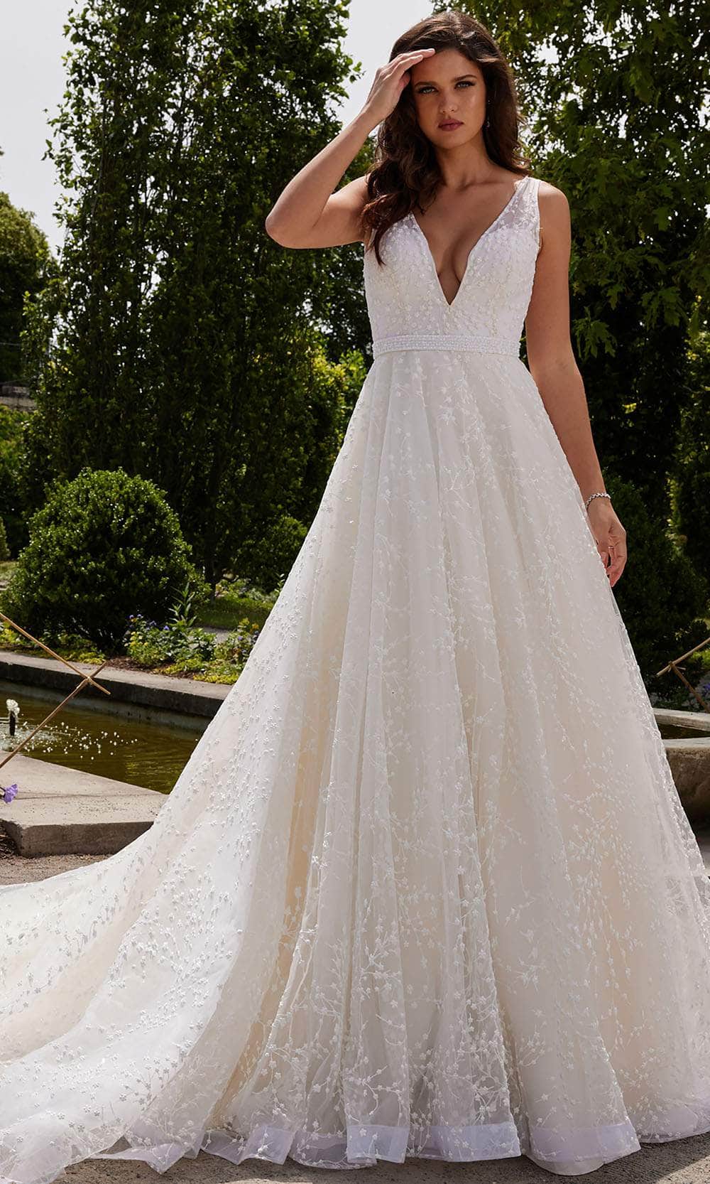 Flourish a timelessly feminine style in this Jovani Bridal JB09491 masterpiece. Amazingly decorated with beaded and floral embroidery, this sleeveless design makes an unforgettable impression on your wedding day. The sheer wide straps support the bodice, complemented by a plunging v-neckline and deep v-open back. Embracing your curves with the thin beaded belt, the skirt has an A-line shape and flows alluringly to the floor-length hem with a chapel train finish. Orchestrate your moment to stand out in this Jovani Bridal JB09491 gown. Model is wearing the Off-White color.