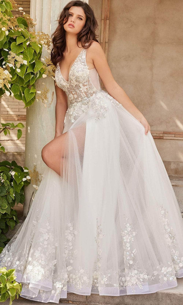 Create a special moment in this Jovani Bridal JB25737 masterpiece. Ornamented with 3D floral applique and glittering beadwork, this sleeveless gown radiates an ethereal charm. The top has an illusion bodice with a deep v-neckline and wide shoulder straps that lead to a plunging v-open back. Parting with a sexy high leg slit for ease of movement, the tulle skirt parades a lovely ballgown silhouette that ends with sweeping train and horsehair hem. Celebrate the journey to forever as you saunter in this gorgeous Jovani Bridal JB25737 creation. Model is wearing the Off-White color.