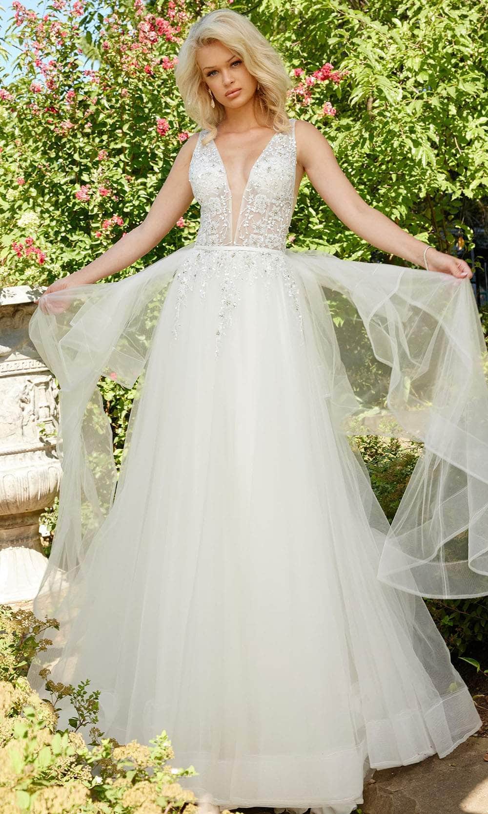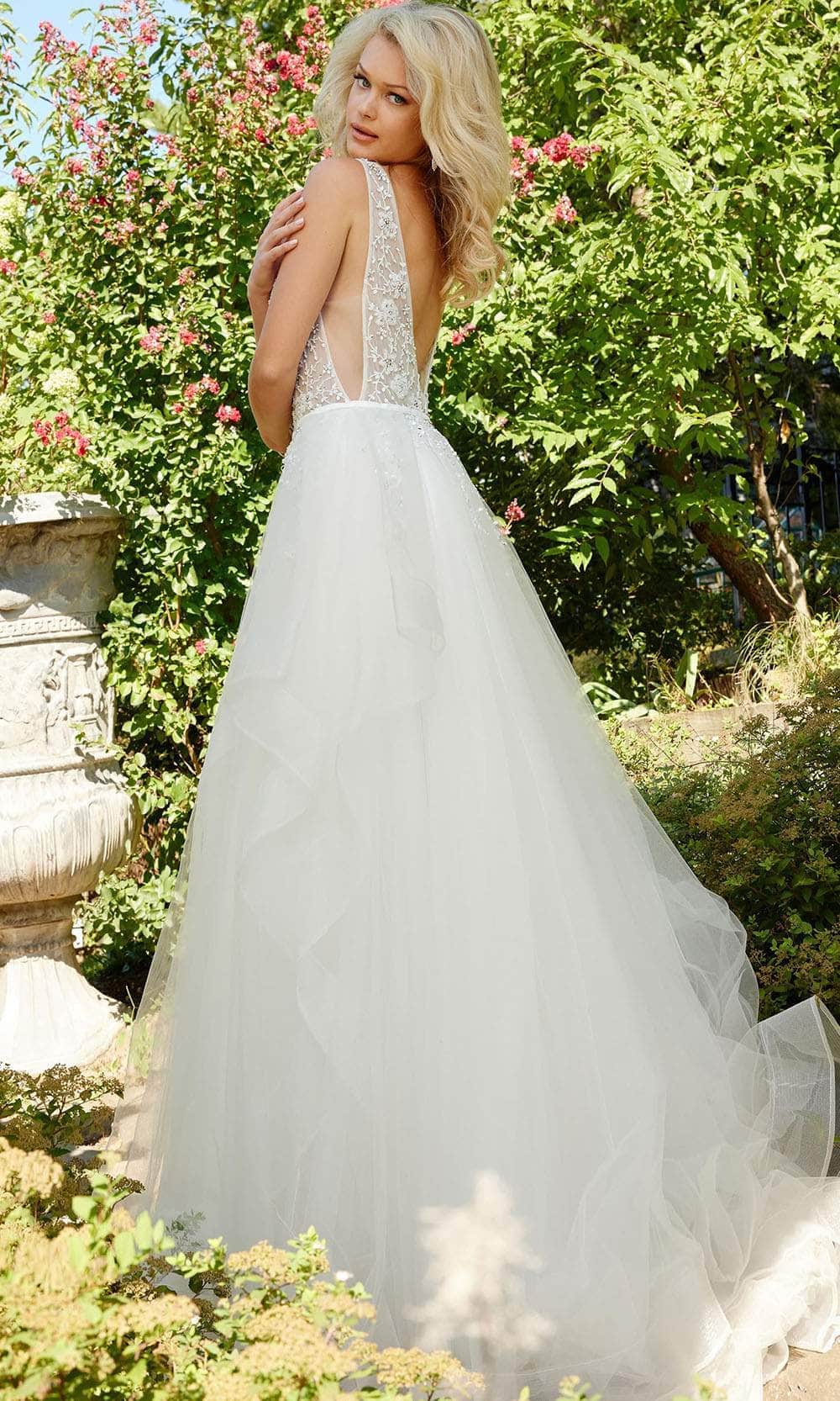 Dazzle on your wedding day in this stunning Jovani Bridal JB3500 gown. With a sleeveless design, the top presents wide shoulder straps with a mirrored plunging v-neckline and v-open back. It is embellished with glistening floral beadwork. The illusion panel at the bust and both sides of the midriff add a hint of intrigue. Intensified by horsehair edges and ruffles, the skirt flares a voluminous ballgown silhouette and ends into a grand sweeping train. This Jovani Bridal JB3500 creation will not let anyone miss your grand entrance. Model is wearing the Off-White color.