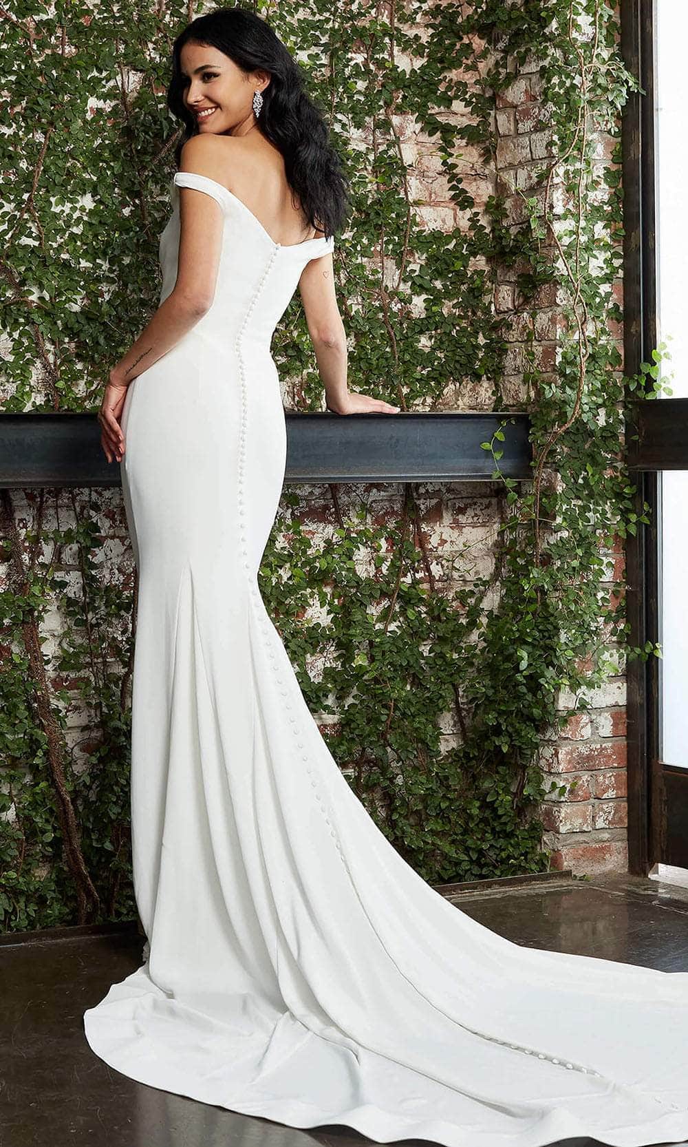 Enter the aisle and do that walk of regal beauty in Jovani Bridal S05489 creation. Simple yet glamorous, the gown features an off-shoulder scoop neckline that accentuates your shoulders and collarbone. The back reveals a mid-open detail with stunning covered buttons that add a touch of vintage charm. Falling gracefully to the floor and chapel train, the skirt reveals a sheath silhouette with back godets accent for added volume. This Jovani Bridal S05489 gown is ideal for a beautiful wedding event that will leave a lasting impression. Model is wearing the Off-White color.