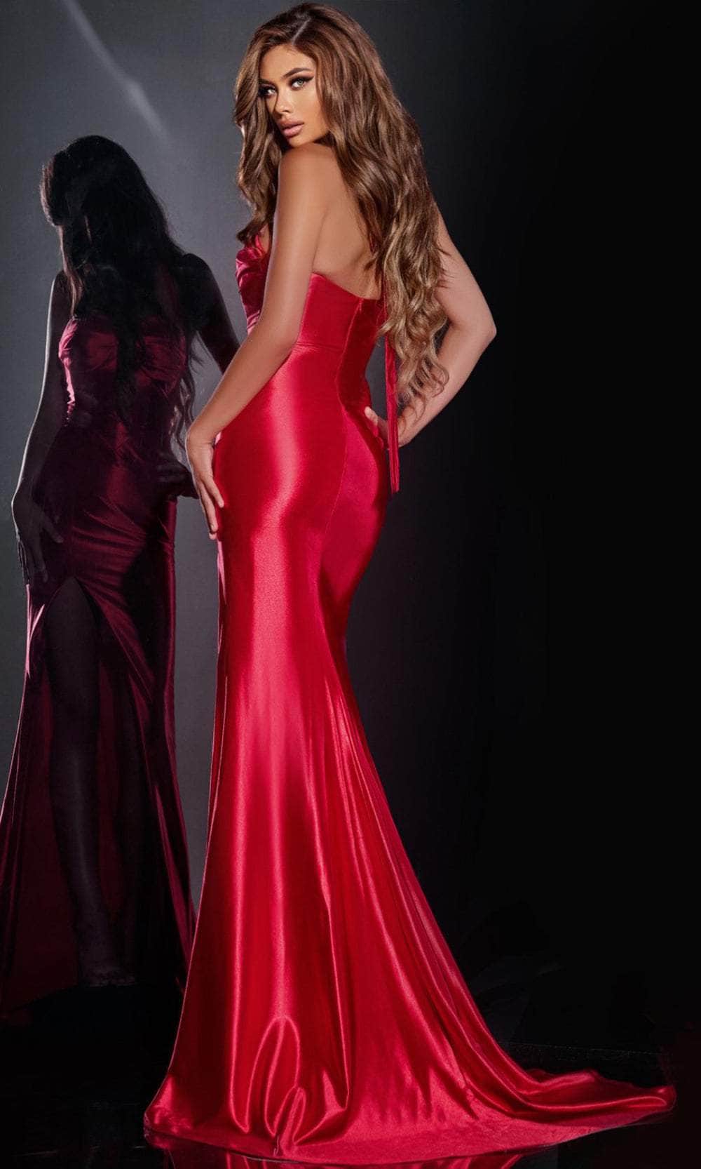 Look amazing for the party in this enchanting Jovani D5006 prom dress. This dress showcases an alluring halter neckline, with a plunging sweetheart style, on a fitted and sleeveless bodice. It also reveals an enticing open back that is enclosed by a zipper for a refined finish, sure to make your audience fall for you. The high slit and the sweep train on the floor-length mermaid skirt also makes this attire looks extra fabulous. Get noticed in this fantastic Jovani D5006 masterpiece. Model is wearing Red color.