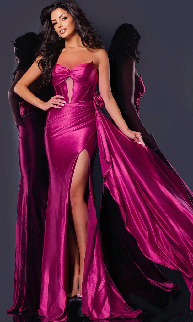 Let this enchanting Jovani D5021 gown create the perfect stage for your unforgettable moments. This outfit features ruched detailing and a corset bodice with exposed boning to expertly sculpt your figure. The thigh-high leg slit and mid-open design in the back reveals just the right hint of allure. The strapless style and sweetheart neckline enhance your decolletage. A side draping highlights a striking 3D floral accent, adding a distinctive touch. Lastly, the sheath skirt gracefully hugs your curves and flows dramatically in sweeping train. You will be envied in an unbeatable masterpiece from Jovani D5021. Model is wearing Hot-Pink color.