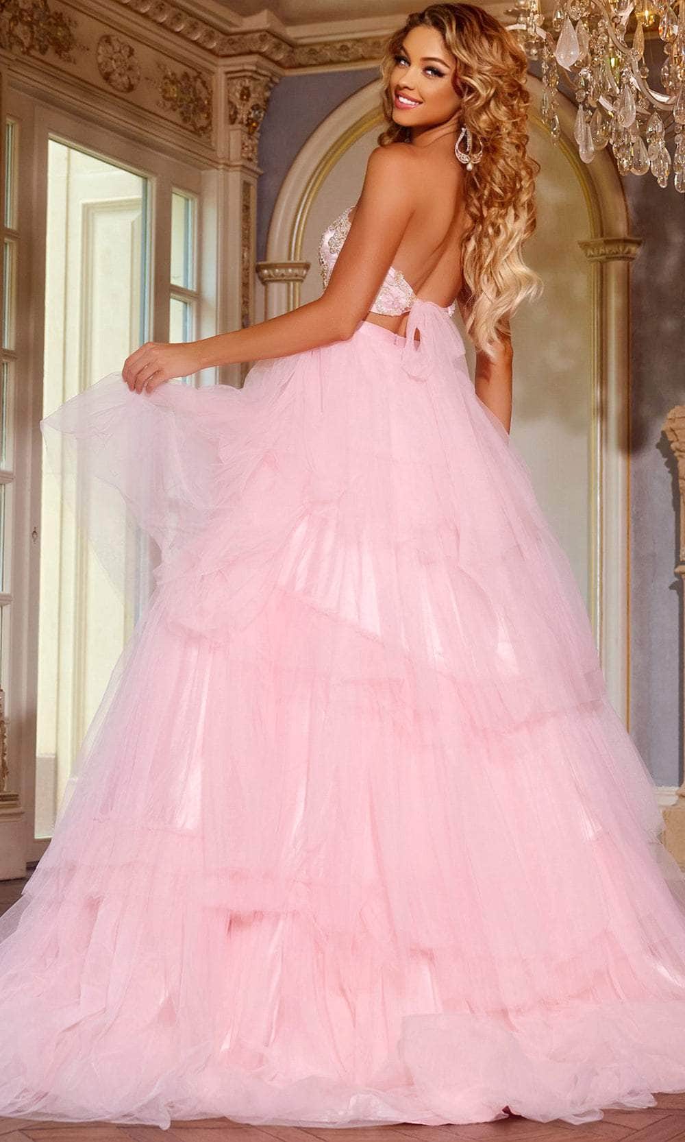 Flaunt your figure in this fabulous Jovani D5112, a two-piece gown crafted from luxurious tulle fabric. This enchanting ensemble features exquisite bead embellishments and delicate tiered ruffles, adding a fairytale-like charm. The cropped bodice ties elegantly at the back, complemented by a secure zipper closure. With its voluminous ballgown skirt cascading to a floor-length hem and finishing with a graceful train, this Jovani D5112, is the epitome of romantic elegance for any special occasion. Model is wearing Pink color.