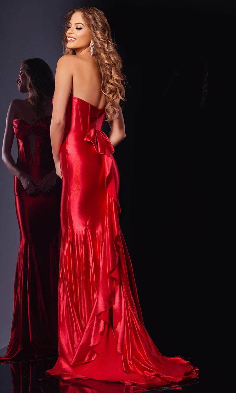 Embrace red-carpet glamour in the Jovani D5119 gown, a breathtaking creation with a strapless corset bodice and a sophisticated keyhole detail. This design features delicate ruching that flatters the silhouette, while a charming bow accent adds a playful yet refined touch. Cascading ruffles flow seamlessly into a mermaid-style skirt that falls to a floor-length hem and finishes with a graceful train. Secured with a back zipper closure, this Jovani D5119 exudes timeless elegance for any grand event. Model is wearing Red color.
