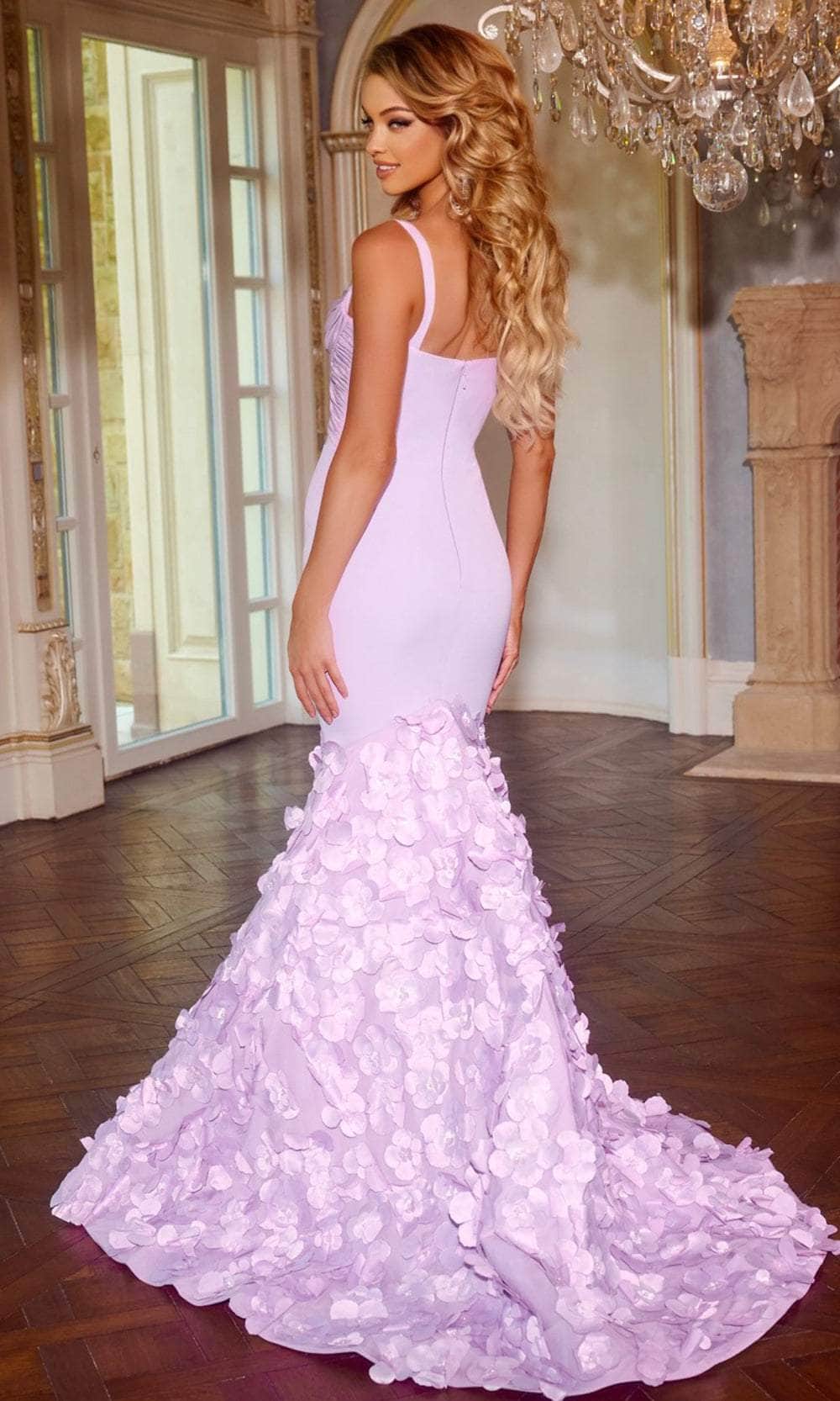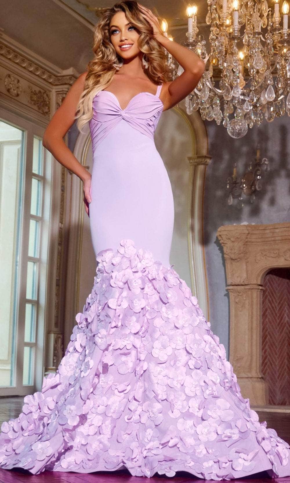 Revel in your beauty and express your unique fashion sense with this Jovani D5309 masterpiece. The sleeveless gown flaunts a beautiful sweetheart neckline with knotted and ruching design for a captivating look. The wide straps gracefully frame your shoulders, leading to the mid-open zippered back. Fitting snugly at the hips, the skirt features a mermaid silhouette that flares from the knees and is embellished with charming 3D floral appliques. Expect to capture everyones attention as you step out in this Jovani D5309 gown. Model is wearing Lilac color.