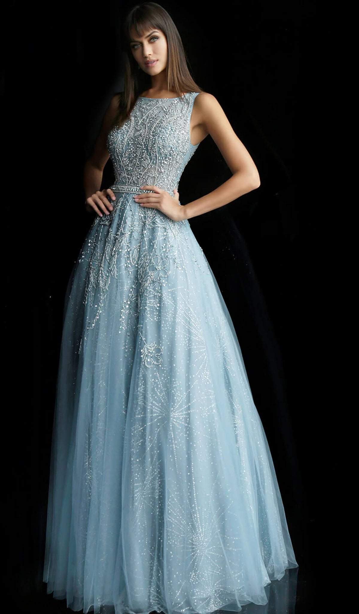 Jovani - Foliage Embellished Bateau Ballgown 62147 - 1 pc Light Blue In Size 12 Available