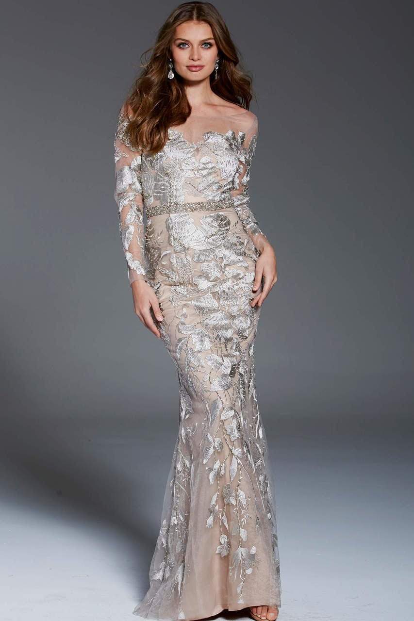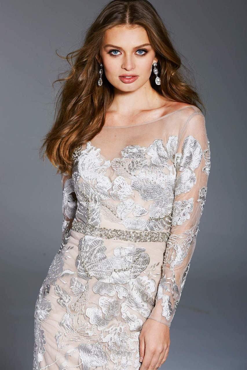 | Details: | Long Sheer Sleeves, Beaded, Embroidered Foliage Motif, Nude Lining, Illusion V-Cut Open Back, Back Zipper Closure, Full Length Hem |
