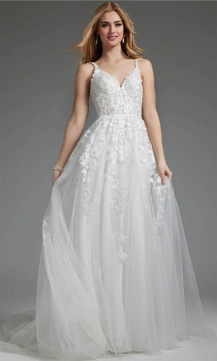 Step into the enchanting world of weddings with the Jovani JB07311 bridal gown. This exquisite gown features a silhouette adorned with tailoring lines, showcasing embellished lace with a Chantilly lace underlay for a touch of romance. The bodice boasts delicate spaghetti straps and a captivating deep V-neckline, beautifully complemented by a sheer corset bodice adorned with floral lace appliques and intricate beadwork. The waist is accentuated by a nipped design, leading to a midrise back with a concealed zipper closure and buttons for a seamless finish. Complete with an A-line silhouette and court train, this gown promises to make your wedding day dreams come true with this Jovani JB07311 bridal gown. Model is wearing the Ivory color.