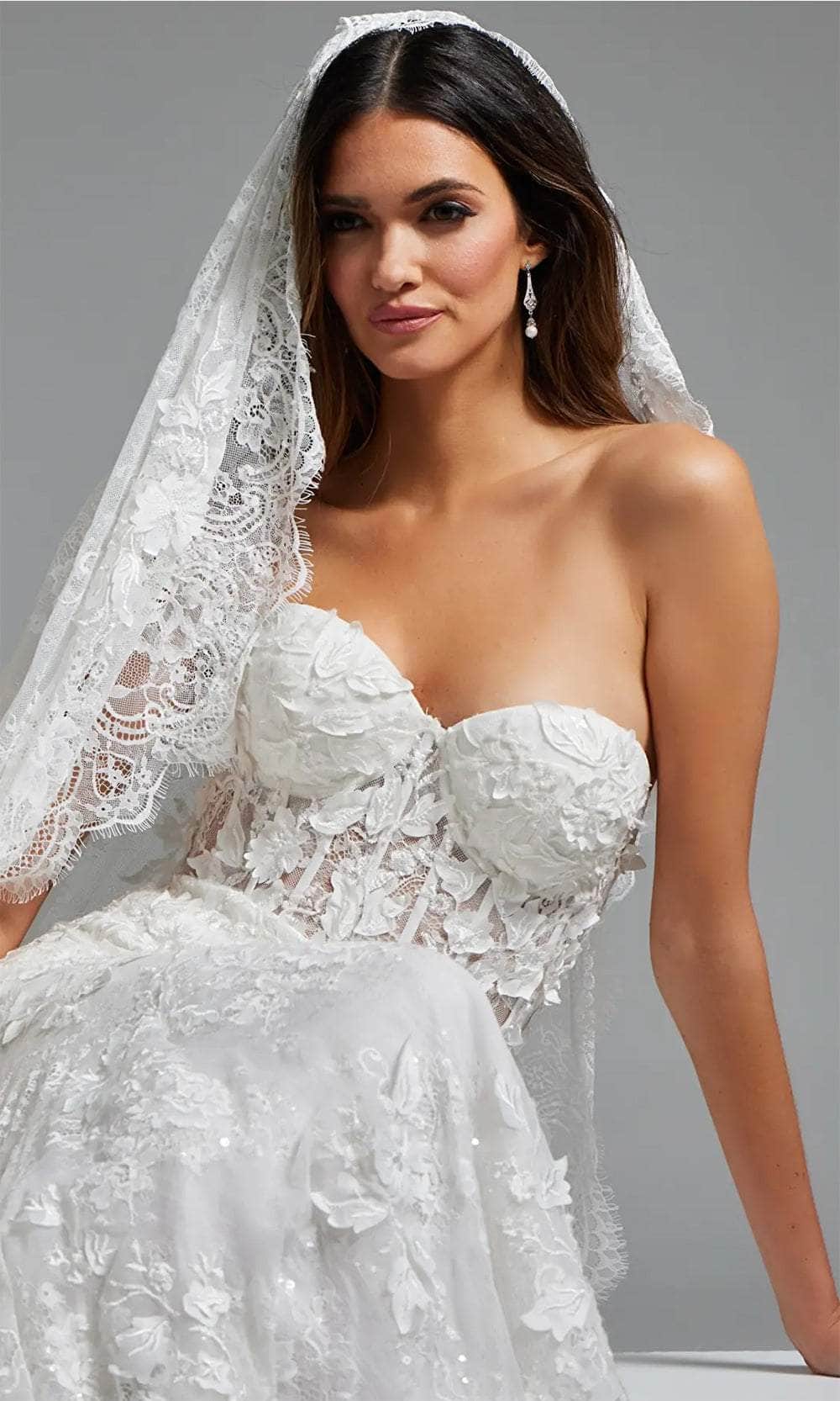Bloom with exquisiteness and love as you walk towards forever in this Jovani JB07583 masterpiece. Fashioned from lace fabric with beads and floral appliques, this strapless gown radiates luxury and glamour. The upper illusion bodice presents a visible boning detail, and a sweetheart neckline coupled by the mid-open back. Sculpted in a trumpet silhouette, the skirt elevates your feminine curves with a horsehair hem and sweeping train for an impressive entrance. This Jovani JB07583 long gown is sure to captivate all in sight. Model is wearing Off-White color.