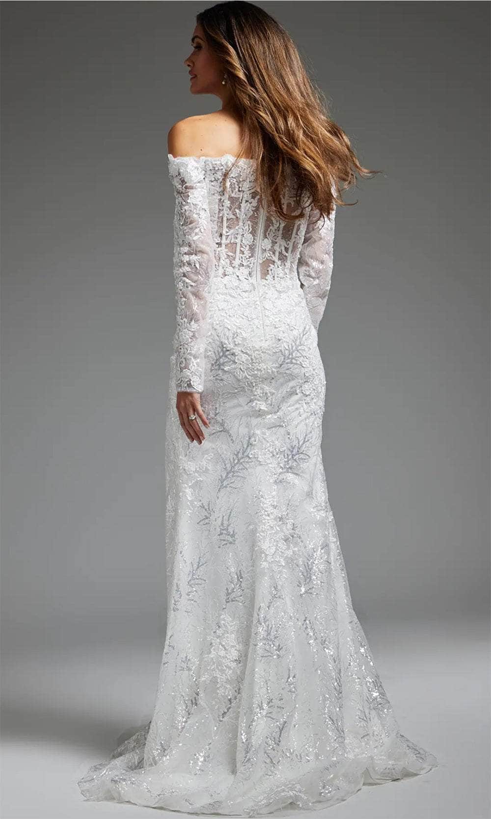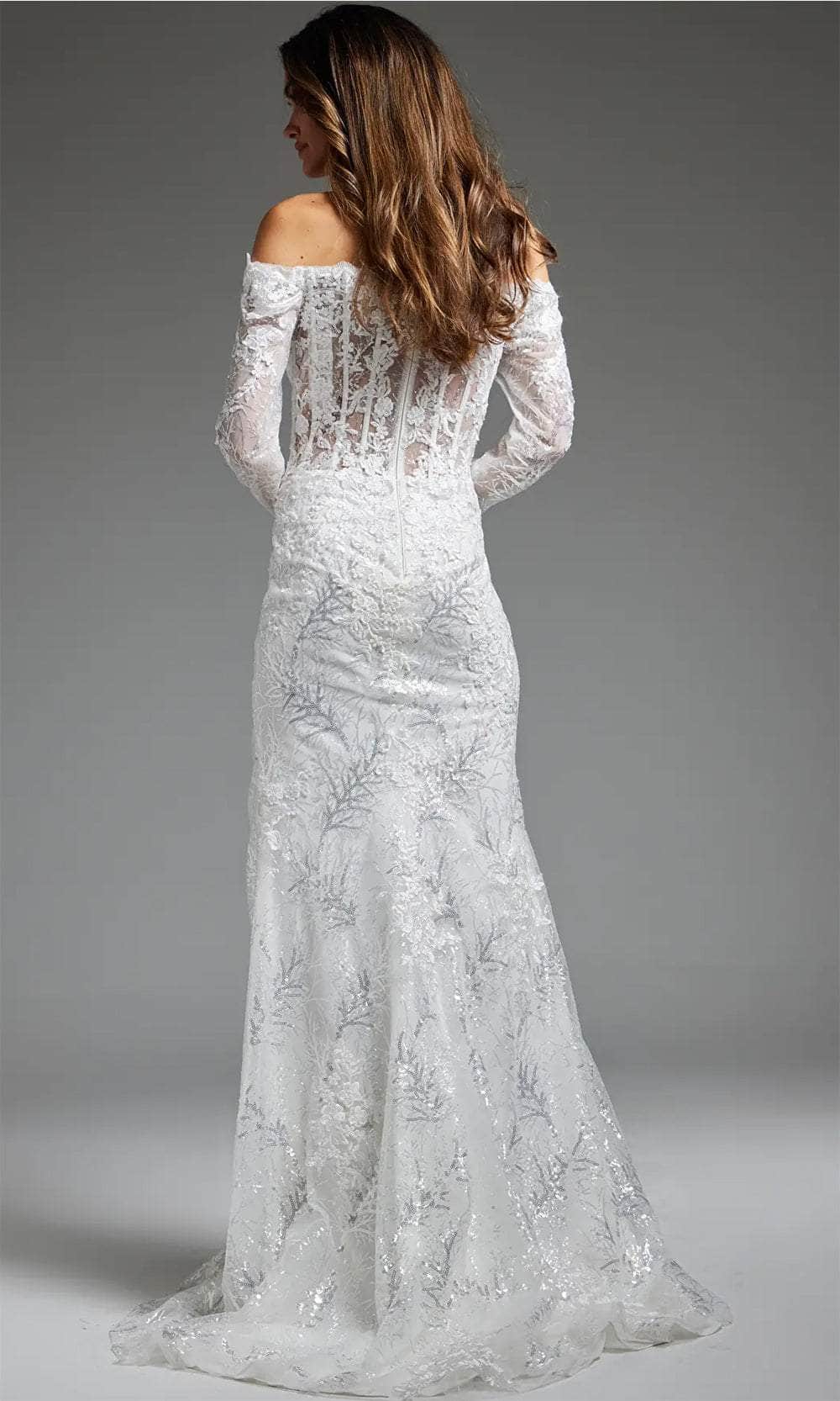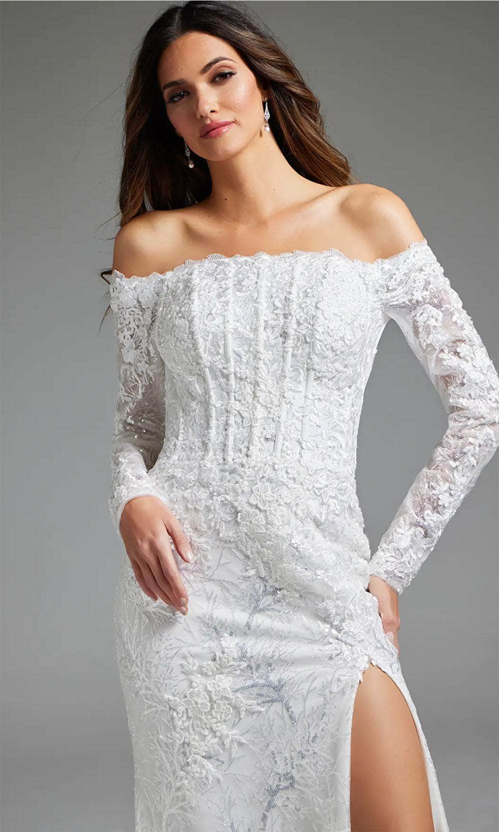 Enter the realm of matrimonial splendor with our captivating Jovani JB23106 bridal gown. Embellished with intricate lace applique on sequins, this gown showcases a silhouette enhanced by precise tailoring lines, embodying elegance. The bodice presents an off-shoulder neckline and sheer long sleeves, elevated by corset boning for a flawless fit. A nipped waist design adds refinement, while the mid-rise back ensures seamless elegance with a concealed zipper closure. The mermaid silhouette of the skirt radiates timeless allure, complemented by a daring high slit and court train. Embrace the romance of your special day with the unforgettable Jovani JB23106 bridal gown. Model is wearing the Off-White color.