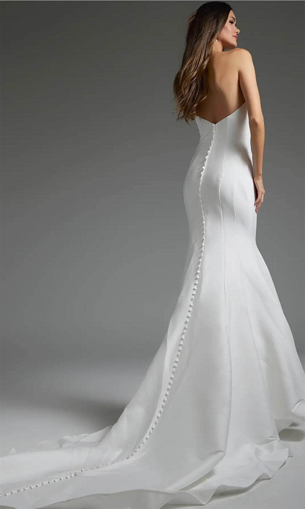 Embrace the essence of bridal sophistication with the enchanting Jovani JB24282 bridal gown. Crafted for the modern bride, this exquisite masterpiece features a silhouette sculpted from luxurious stretch mikado, adorned with tailored lines for a flawless fit. The bodice boasts a strapless design, a graceful scoop neckline, and a draped front. A nipped waist accentuates the figure, leading to a low open back adorned with concealed zipper closure and delicate button details. The skirt cascades into a mesmerizing mermaid silhouette, gracefully sweeping into a court train. Elevate your bridal style with the unparalleled allure of Jovani JB24282 bridal gown. Model is wearing the White color.