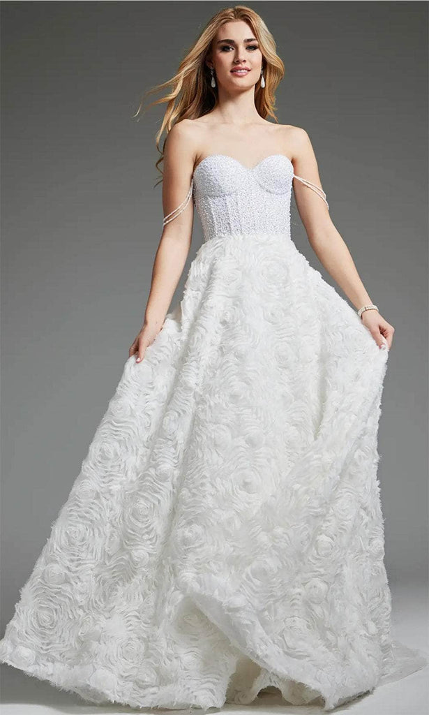 Elevate your bridal ensemble with the timeless elegance of the Jovani JB36644 bridal gown. Embrace romance with the textured floral silhouette and delicate beaded straps that adorn the bodice. This strapless beauty features a sweetheart neckline and corset boning. The nipped design at the waist accentuates your figure, while the midrise back boasts a concealed zipper closure for a seamless look. Cascading into a floral textured A-line skirt with a court train, this gown epitomizes sophistication and grace, perfect for your special day. Walk down the aisle in exquisite style with Jovani JB36644 bridal masterpiece. Model is wearing the Off-White color.