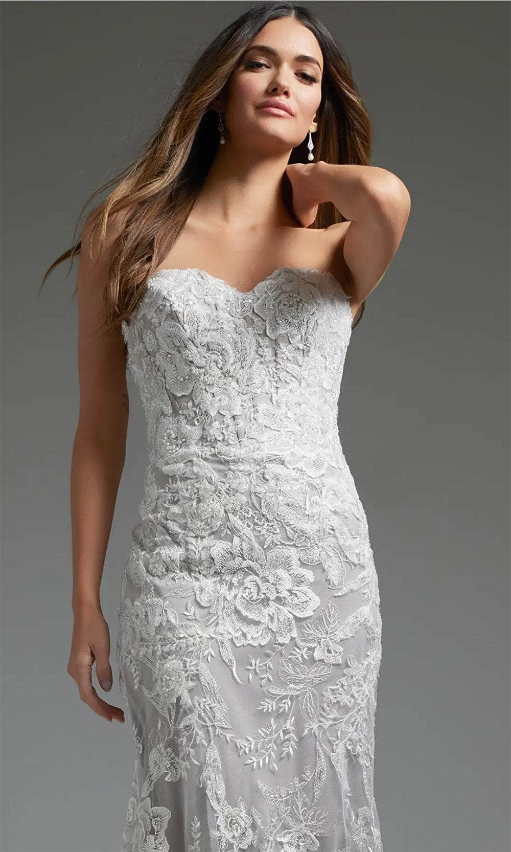Elevate your bridal elegance with the timeless allure of the Jovani JB38221 bridal gown. This enchanting masterpiece features a silhouette adorned with delicate floral lace fabric. The strapless bodice boasts a sweetheart neckline and intricate applique embellishments, complemented by corset boning for a flattering fit. Accentuating the waist with a nipped design, the gown reveals a sheer lace midrise back with concealed zipper closure and button details. The mermaid silhouette skirt gracefully hugs the curves, flowing into a sweep train that exudes timeless glamour. Make your wedding day unforgettable with the exquisite Jovani JB38221 bridal gown. Model is wearing the Ivory color.