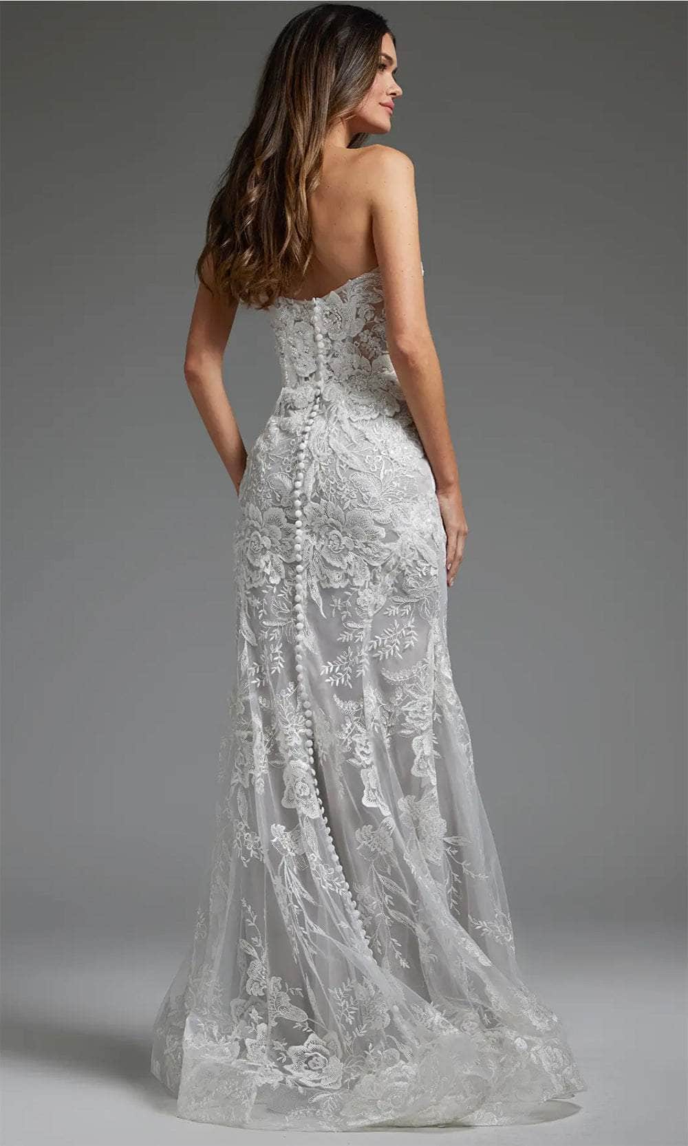 | Details: | Strapless, Corset Boning, Floral Lace, Midrise Back, Concealed Zipper Closure, Button Details, Sweep Train |