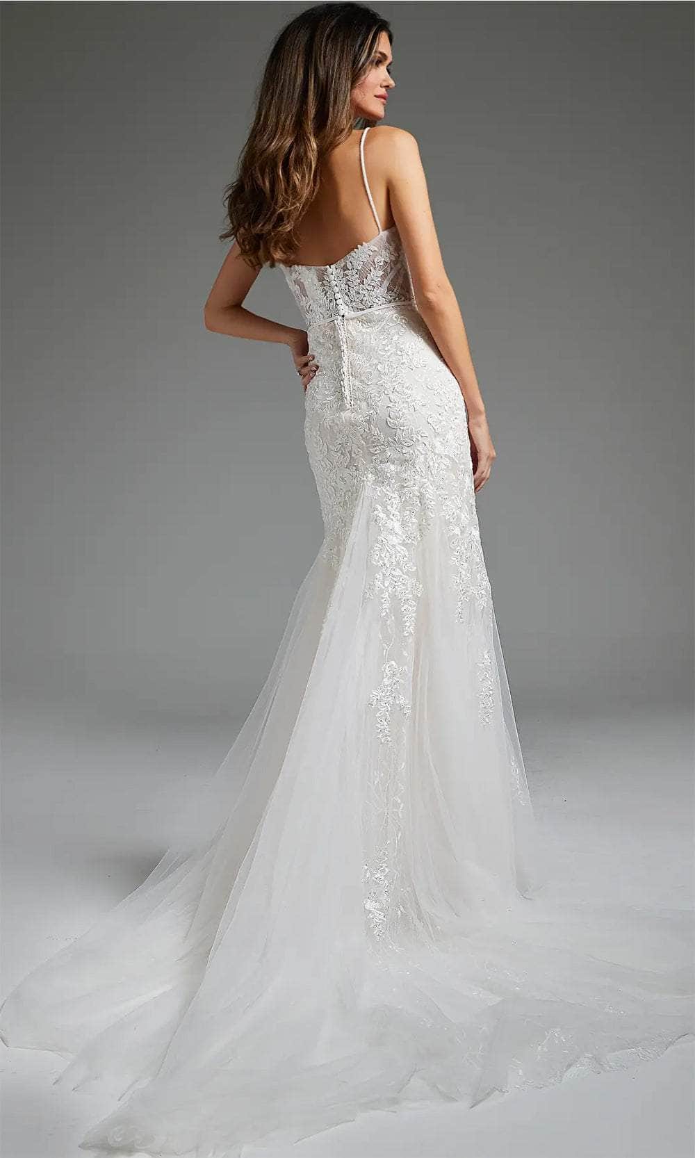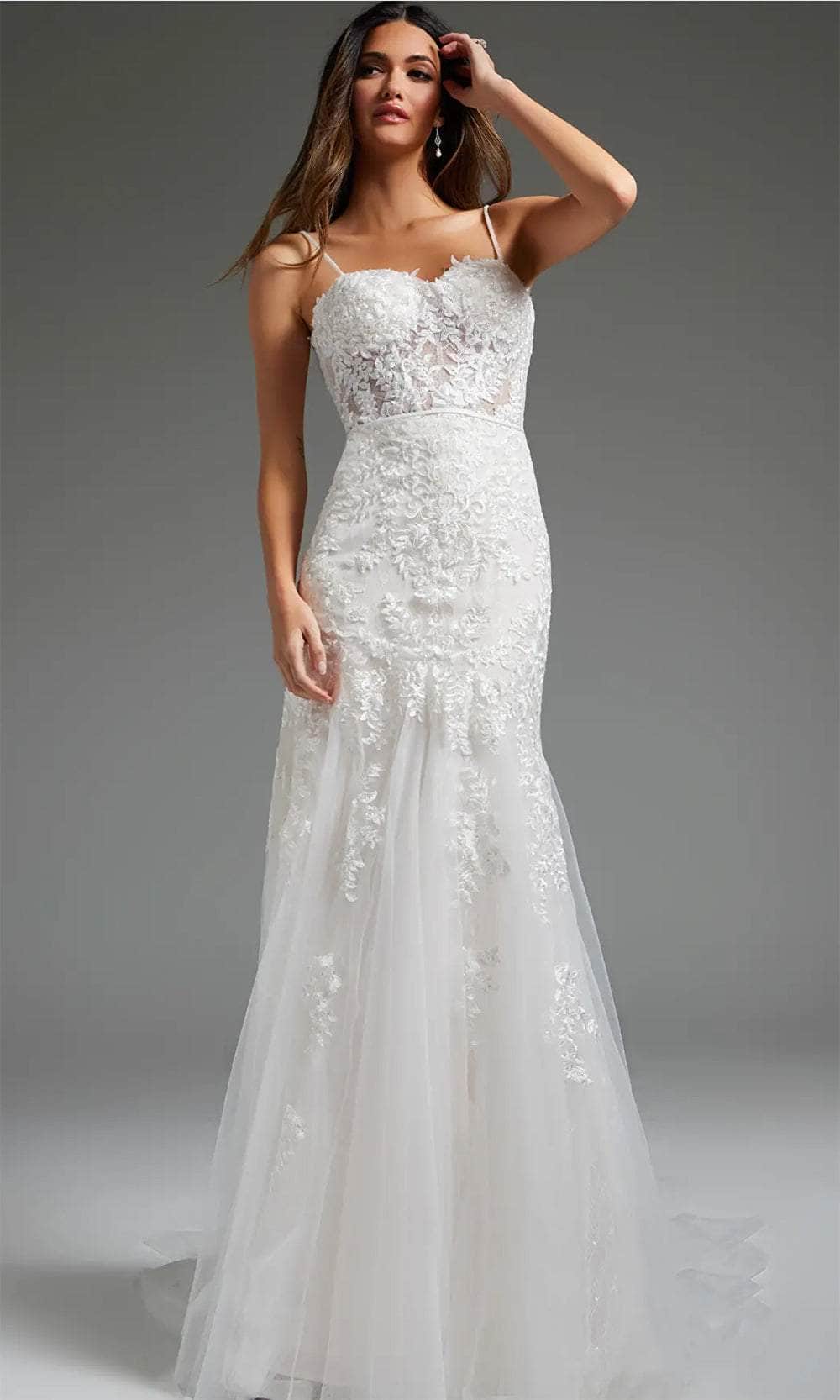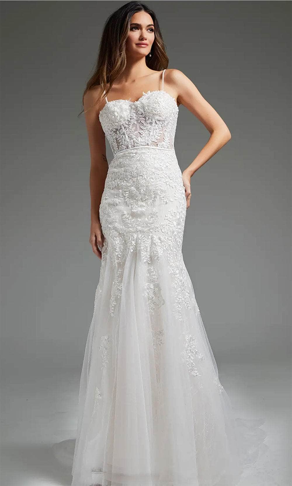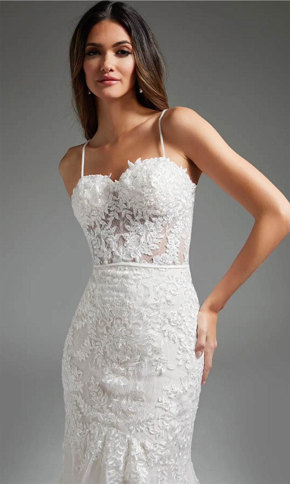 Step into your fairytale wedding with the enchanting Jovani JB38490 bridal gown. Adorned with embroidered lace and sequins on glitter mesh, this gown creates a mesmerizing silhouette with its tailored lines. The bodice features delicate spaghetti straps, a romantic sweetheart neckline, and a flattering corset bodice. A nipped waist enhances the figure, while the midrise back, concealed zipper closure, and button details add a touch of elegance. The trumpet silhouette of the skirt gracefully cascades into a court train, adding a regal finish to your bridal look. Make your dream wedding a reality with the timeless beauty of Jovani JB38490 bridal gown. Model is wearing the Off-White color.