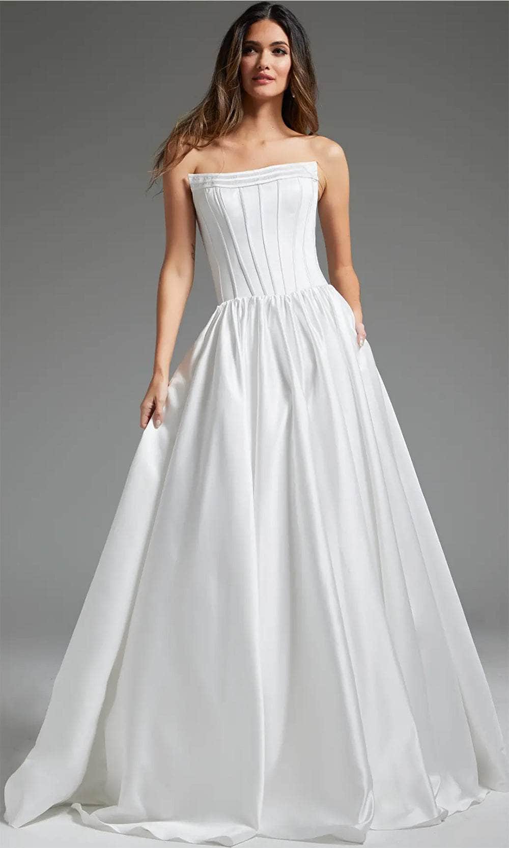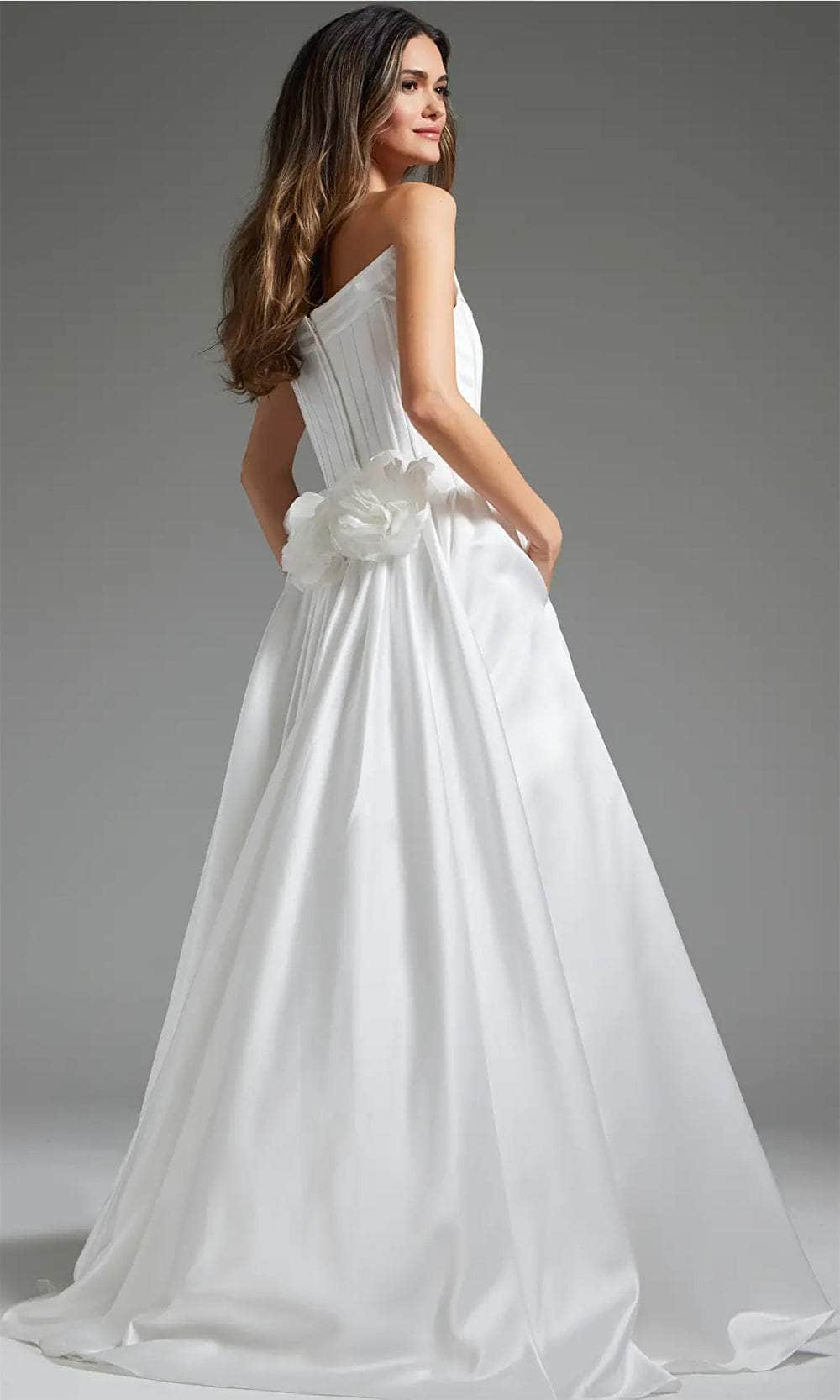 Embrace timeless charm on your special day in this masterpiece from Jovani JB40784. This strapless beauty exhibits a corset bodice with exposed boning details for support and style. The straight-across neckline and mid-open back add a hint of allure. It also comes with a zipper closure to make dressing up a breeze, and the 3D floral appliques at the back offer a whimsical touch. The A-line skirt with gathered details at the natural waist flows gracefully into a sweep train. Leave everyone speechless when you enter the aisle in this Jovani JB40784 gown. Model is wearing Off-White color.