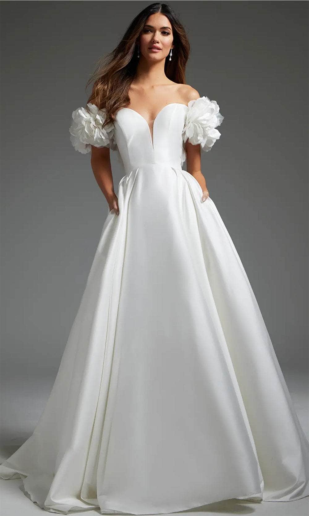 Make lifetime reminiscences in this Jovani JB40795 creation. his beautiful piece flourishes an off-shoulder v-neckline that gracefully emphasizes your collarbones. The floral applique on the short sleeves leads to the mid-open back that gives a whimsical charm. The back button closure adds a modern twist as it drapes from the top down to the hem. Spilling to dramatic sweeping train, the skirt forms an A-line silhouette that embraces all curves and ends with pleated details. You are bound to be the center of attention when you wear this Jovani JB40795 gown. Model is wearing Off-White color.