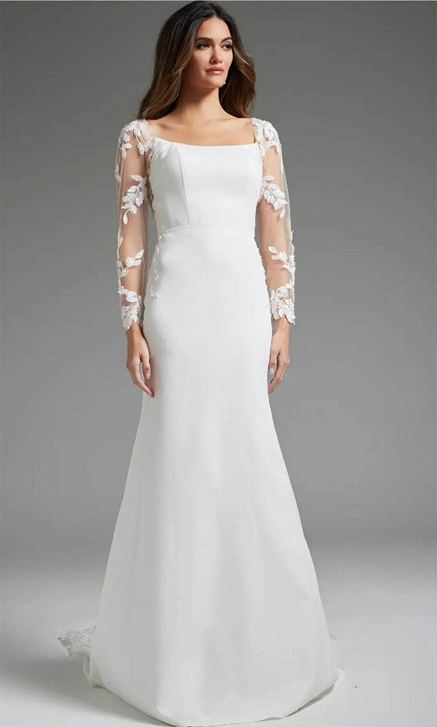 Stand out and capture hearts at your wedding ceremony in this Jovani JB42297 masterpiece. This ensemble creates a breathtakingly elegant appearance with its beads and leaf lace appliques on the illusion bodice. The square neckline paired with illusion long sleeves offers a modern touch. Additionally, the illusion full back is beautifully secured by the decorative button closure. For unparalleled charm, the sheath skirt drapes effortlessly to the floor and ends in a lace court train. Fall in love when you slip on this Jovani JB42297 long gown. Model is wearing Ivory/Nude color.