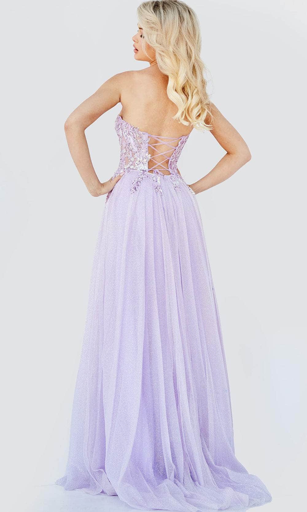 Parade those gorgeous curves and wrap them with beauty in this Jovani JVN07434 creation. Tailored with sculpting lines on a sheer corset bodice, this dress crafts a sweetheart neckline on a strapless silhouette. Sprinkled with shimmering sequins and ornaments along the bodice and a lace up styled open back, this piece opens up with a slit that flaunts those shapely legs. The skirt then cascades stunningly into an A-line silhouette with a spill of train. Be obsessed by the statuesque beauty and flair of this Jovani masterpiece. Models are wearing the Lavender and Pink colors.