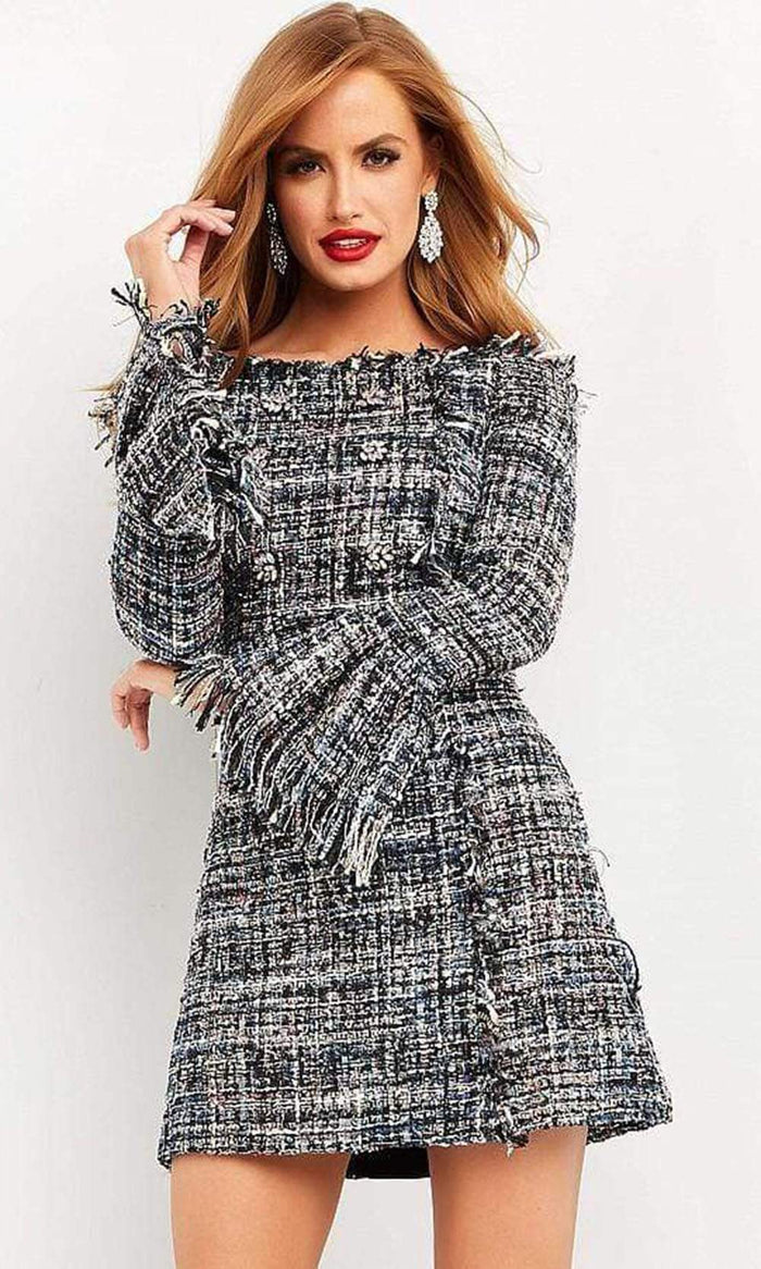 Make it your event worth reminiscing in this Jovani M03273 dress. This short dress highlights an off shoulder neckline supported by long sleeves in a fitted bodice. The skirt reveals an A-line silhouette while the back shows a mid-open back with back zipper closure. Proceed in confidence with this Jovani creation. Model is wearing Multi-Color.