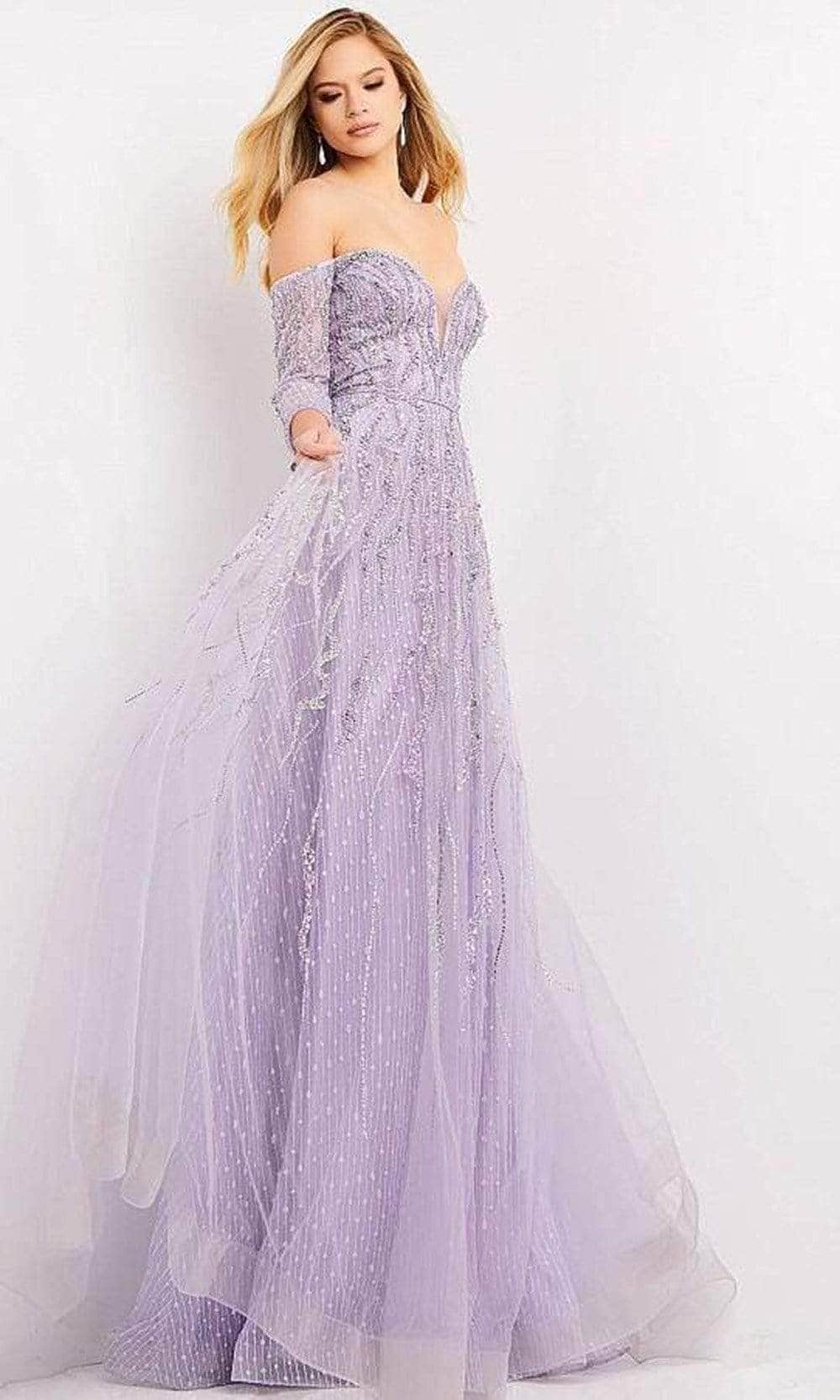 Be a princess of the night as you wear this amazing gown that features a plunging neckline with sheer panel and off shoulder three-quarter sleeves. It is embellished with beads throughout that shine every tie the spotlight is on you. The skirt has a sweep train and it flows beautifully on the ground. The back has a back zipper for security. Model is wearing the Purple color.