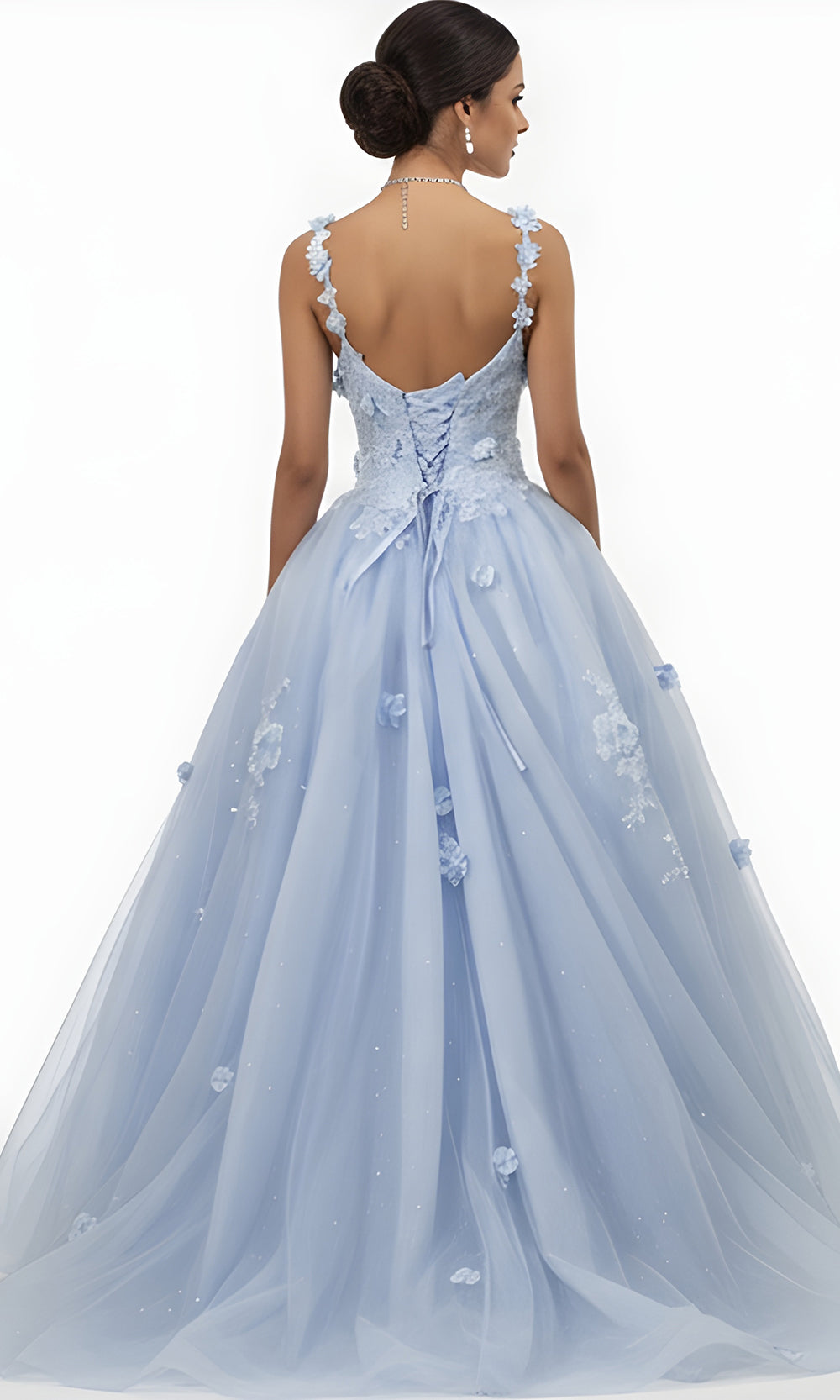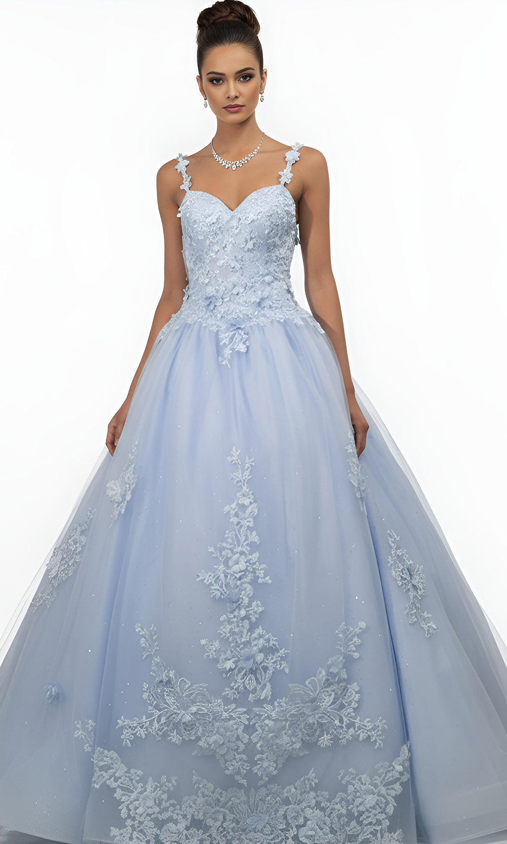 Romantic artistry comes alive in this Jovani Q39393 style that combines delicate lacework with grand volume. The sweetheart neckline is framed by floral thin straps, drawing subtle charm to the shoulders. From the fitted bodice, floral embroidery cascades gracefully into a flowing ballgown skirt that creates soft movement. The layered design gives fullness without excess weight, ensuring comfort with every step. Let your story unfold beautifully in Jovani Q39393, a timeless ballgown that celebrates sophistication and poise. Model is wearing Light-Blue color.