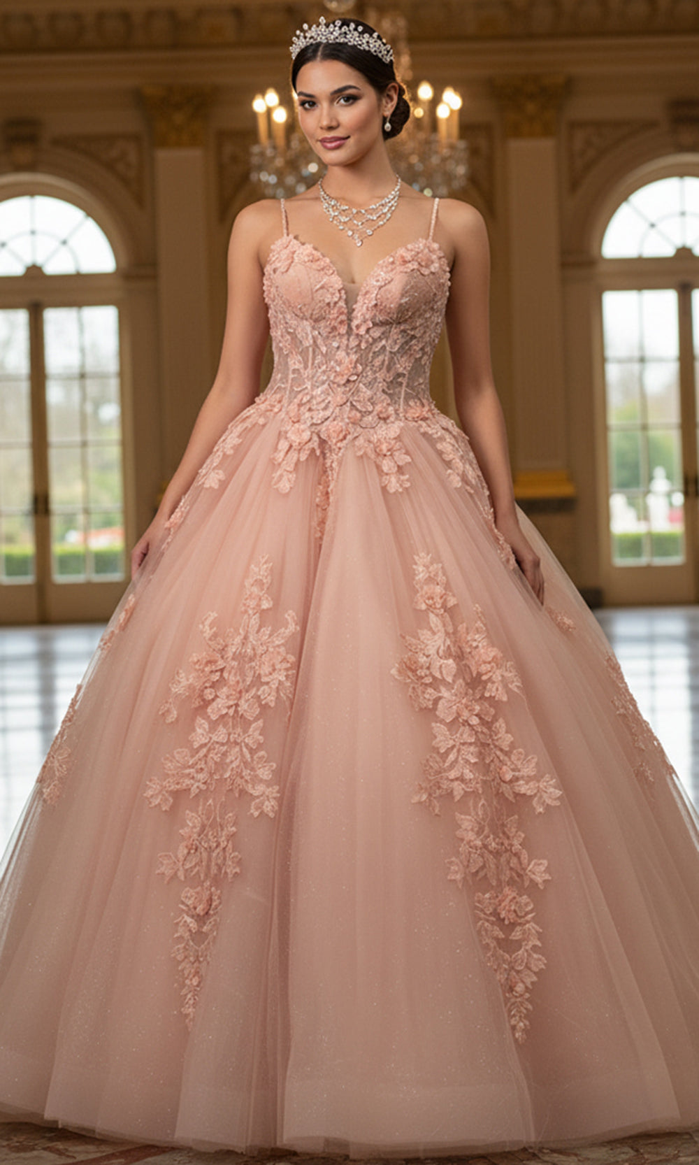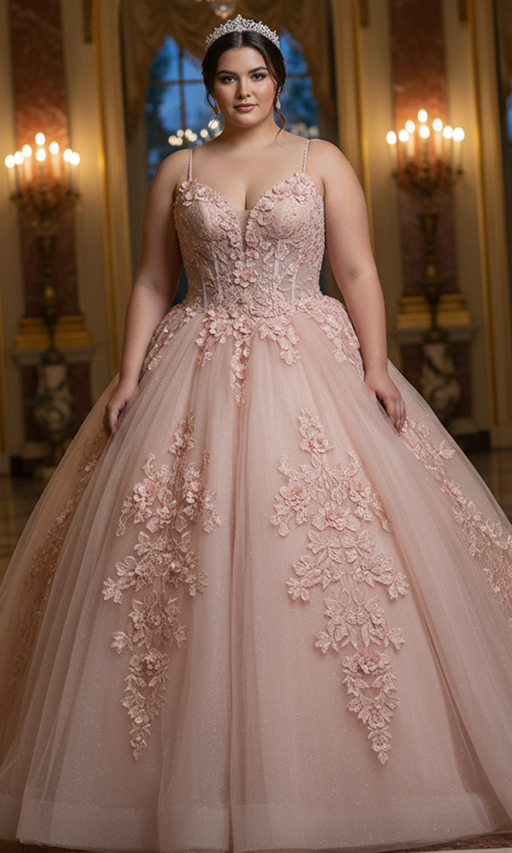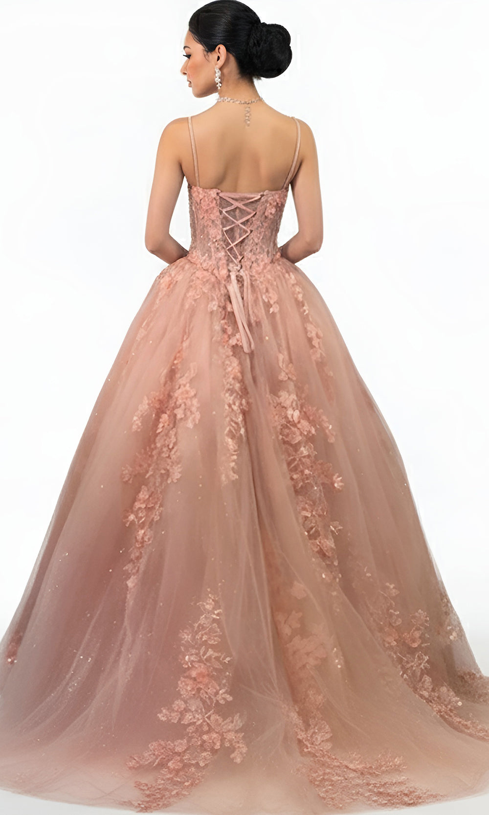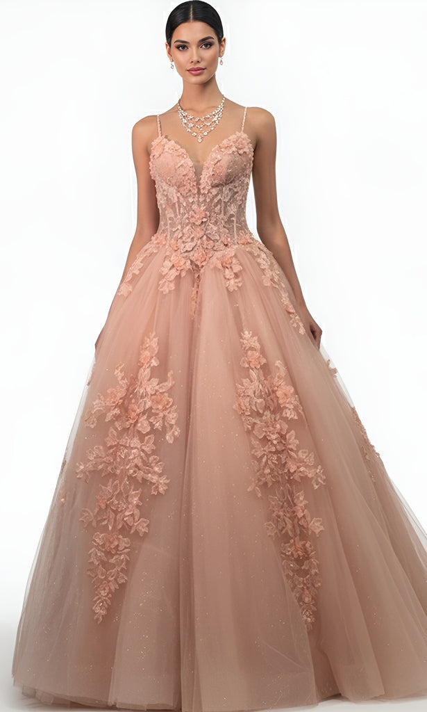 Every glance at this Jovani Q43431 gown reveals the perfect harmony between structure and artistry. The fitted illusion bodice showcases floral embroidery that accentuates the plunging v-neckline and bodice contours. Slim spaghetti straps lend a refined touch, while the layered ballgown skirt flows effortlessly in a dramatic sweep train. The embroidery extends downward, creating graceful continuity from bodice to hem. Jovani Q43431 captures pure romance through intricate detail and an unforgettable silhouette made to shine at any grand occasion. Model is wearing Blush color.