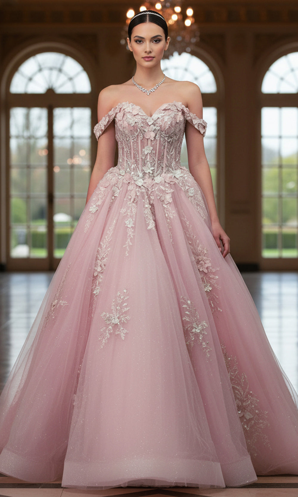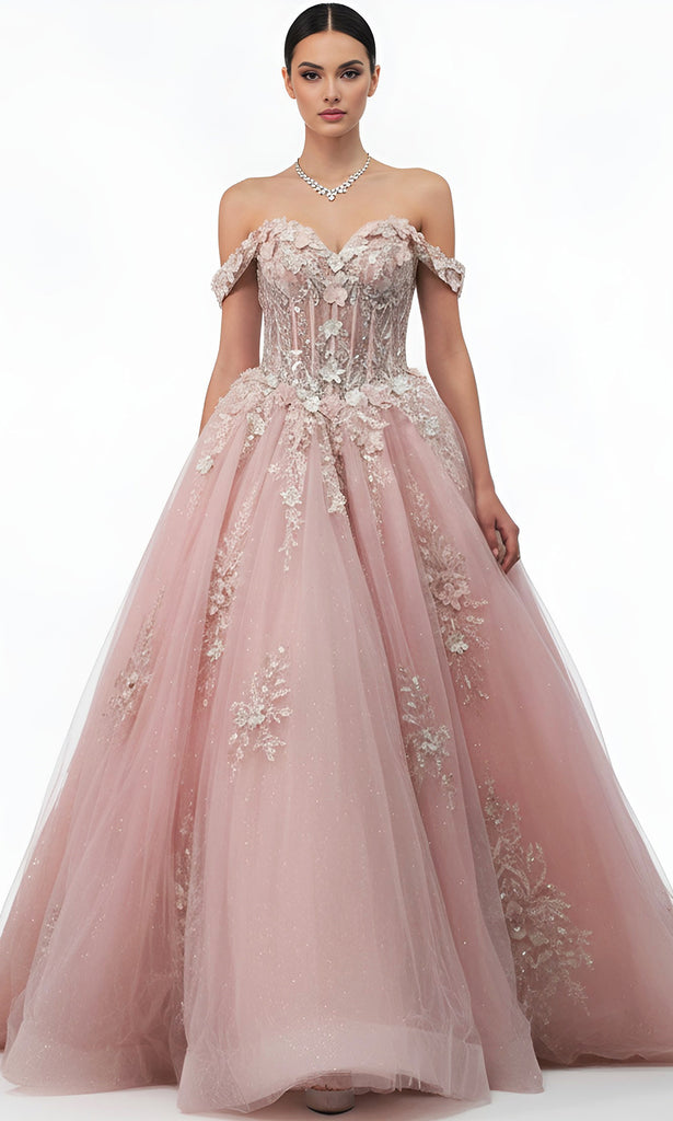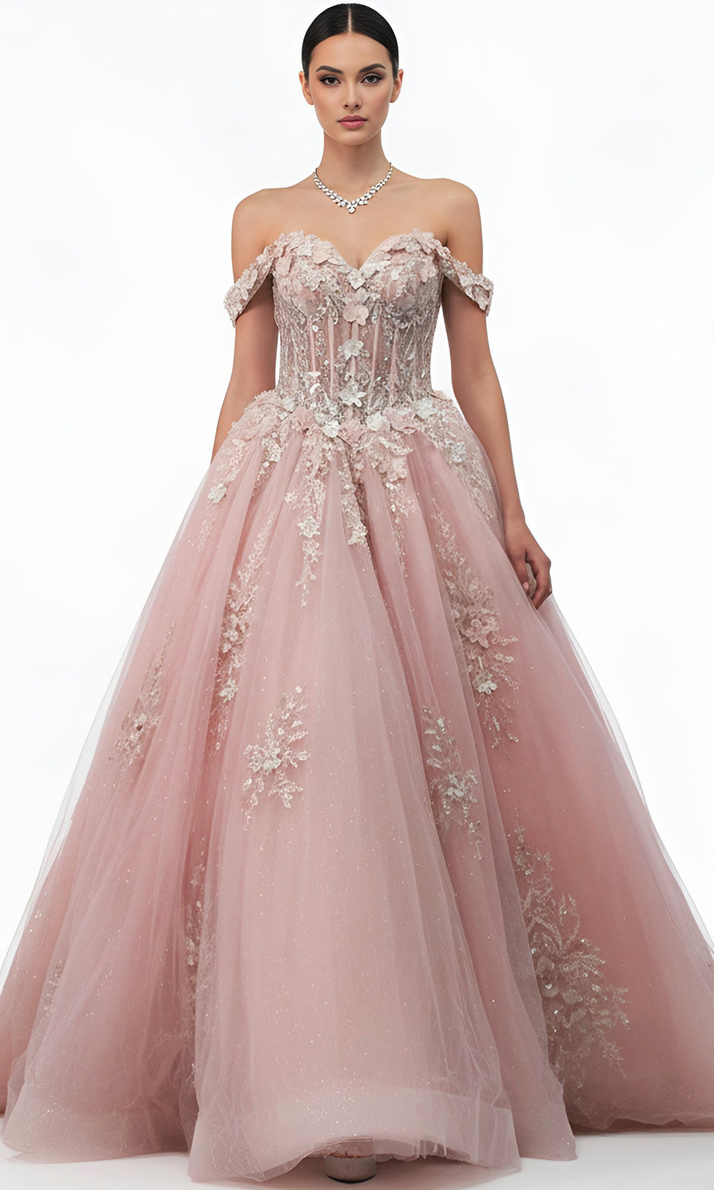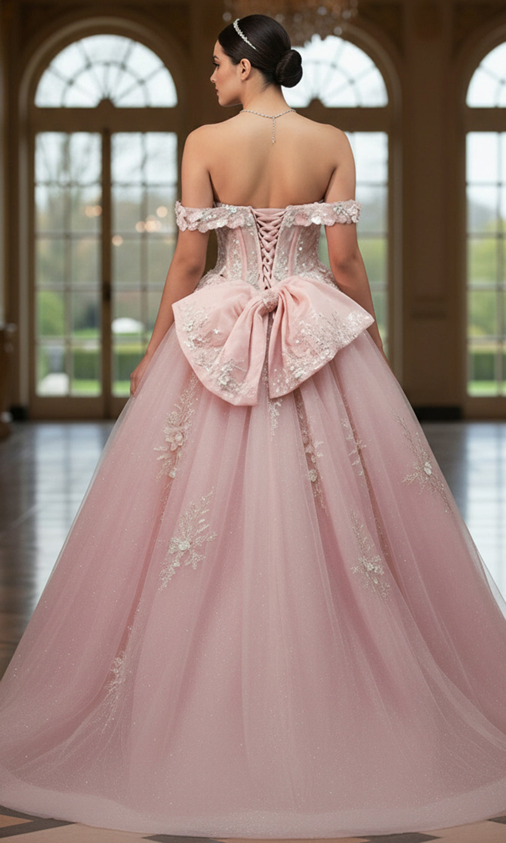 | Details: | Off Shoulder Sleeves, Sheer Corset Bodice, 3D Floral Appliques, Embroidery, Statement Bow Back, Lace-Up Closure |