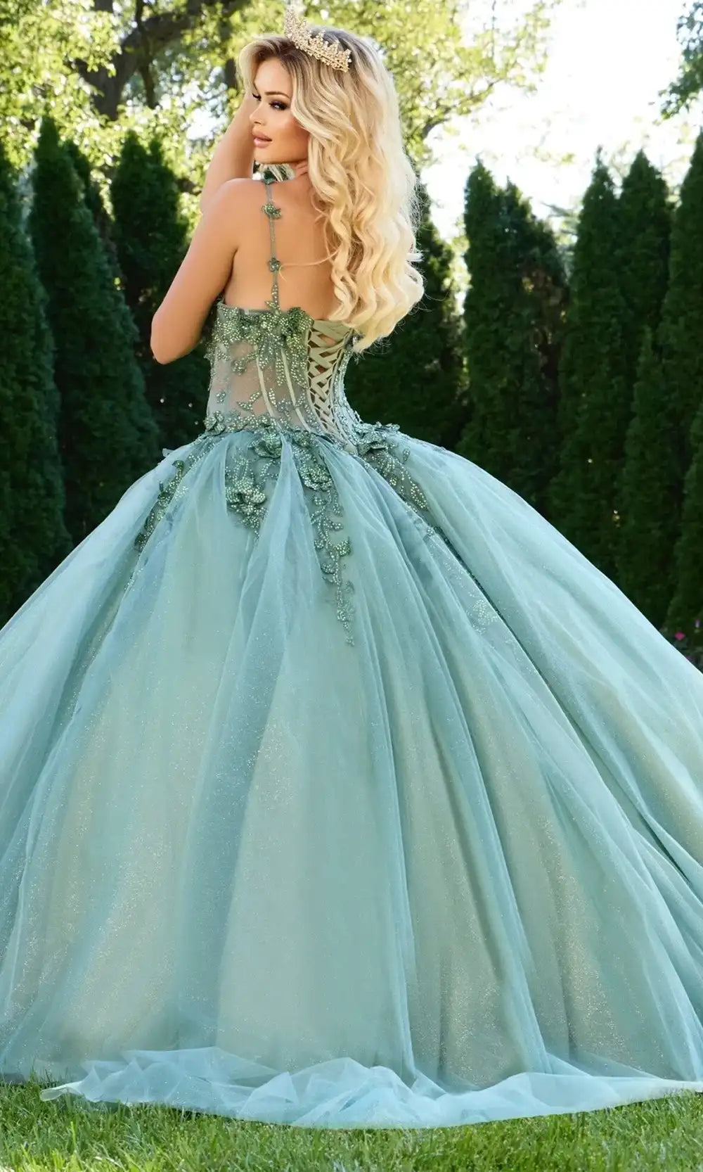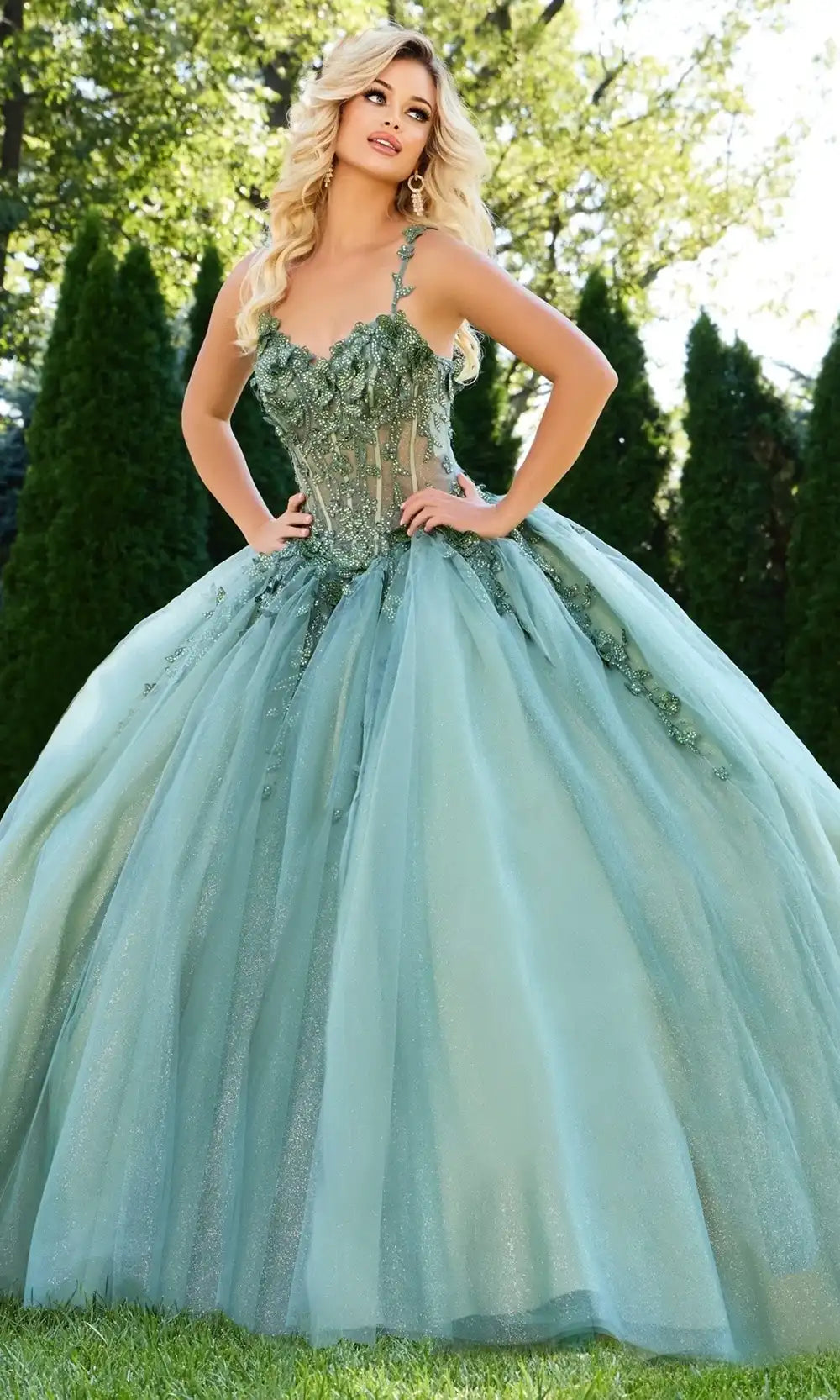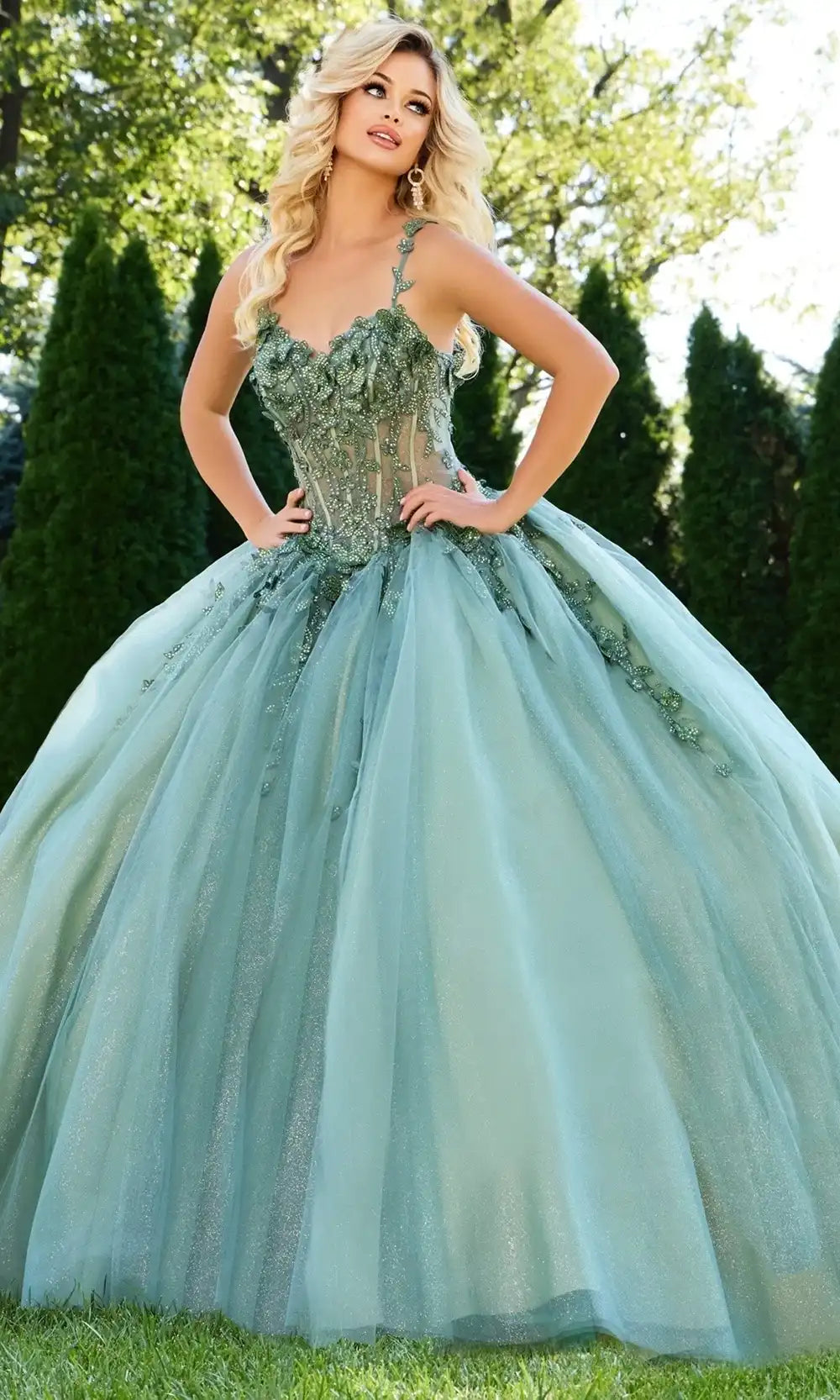 Step into a celebration of movement and form with Jovani Q43437 masterpiece. Its structured corset bodice is paired with a lace-up closure that shapes the waist and allows for a refined fit. Textured floral appliques and beading build dimension across the skirt, contributing to the gown dynamic presence and storytelling detail. The sweetheart neckline flatters the upper frame and offers balance to the layered volume below. This gown is a defining piece for quinceanera occasions where beauty and confidence take center stage. Jovani Q43437 is made for moments worth remembering. Model is wearing Sage color.