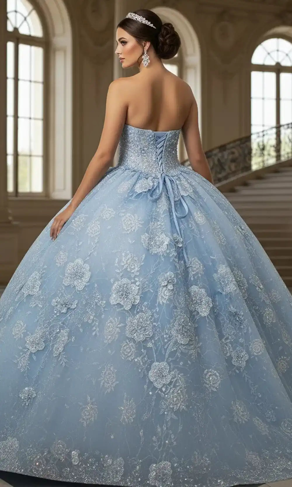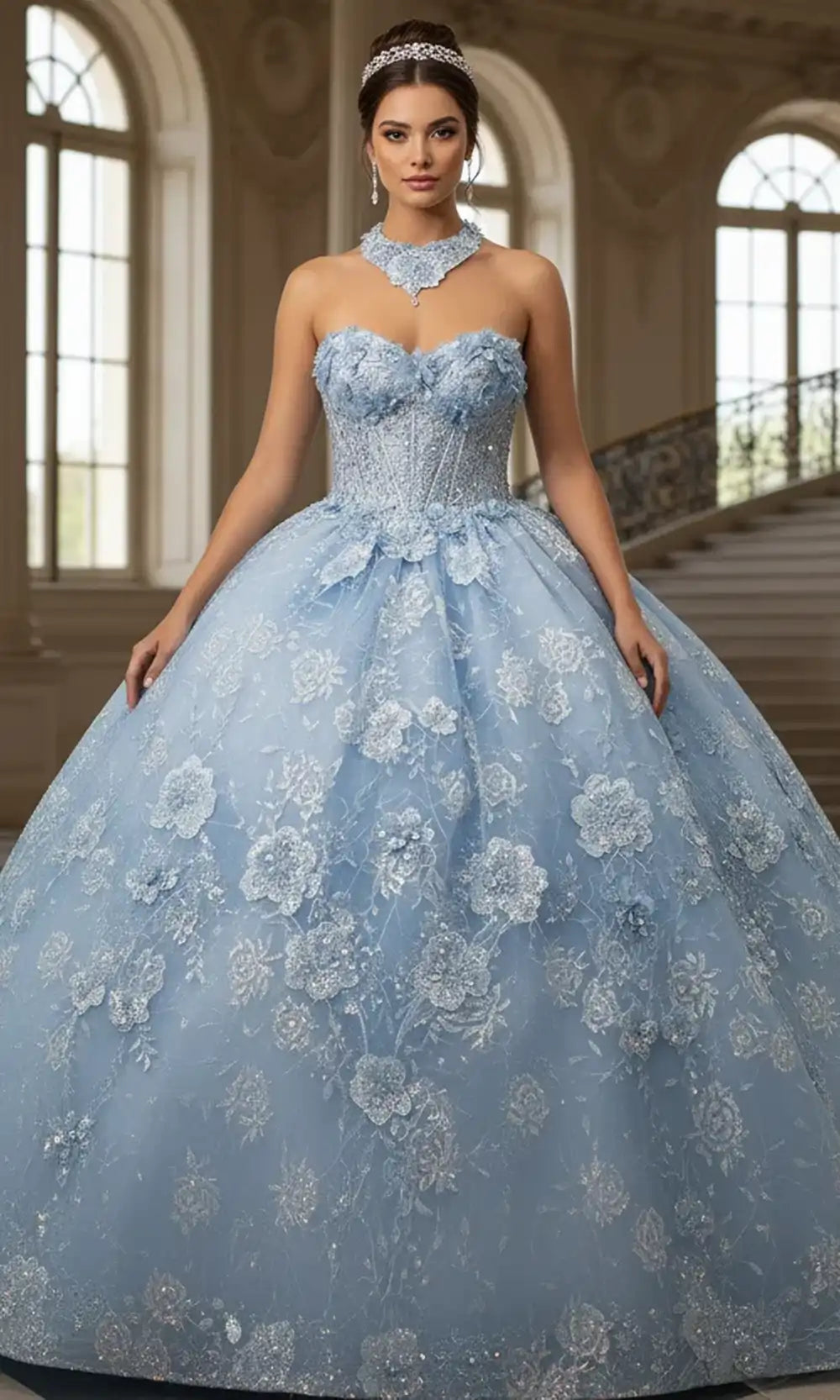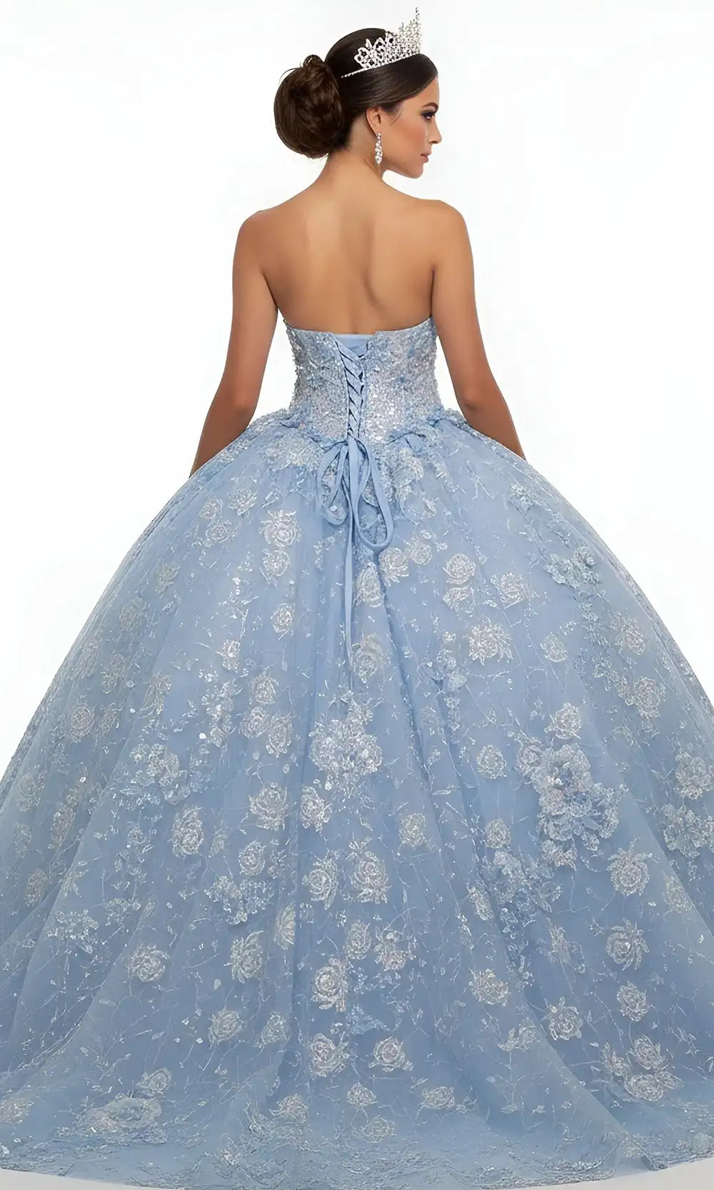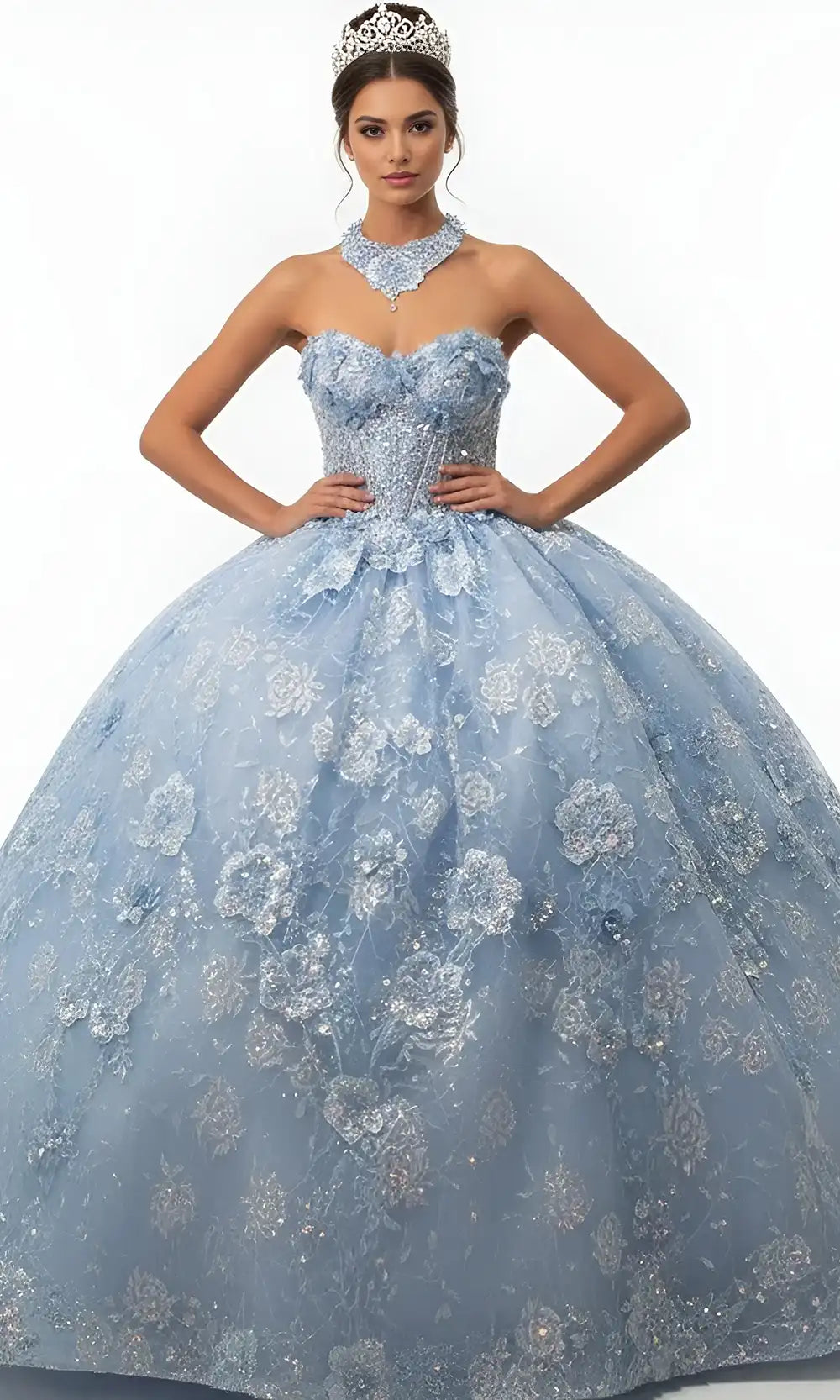 Majestic detailing and graceful movement combine in this exquisite Jovani Q43813 ballgown that feels straight out of a dream. The strapless sweetheart neckline enhances the collarbone while drawing focus to the intricately embroidered corset bodice. Lace embroidery continue throughout the expansive skirt, shimmering softly as they catch the light. A natural waistline defines the figure before cascading into the full, floor-length silhouette. Jovani Q43813 embodies timeless glamour and artistic craftsmanship, making it a gown worthy of unforgettable celebrations. Model is wearing Blue color.
