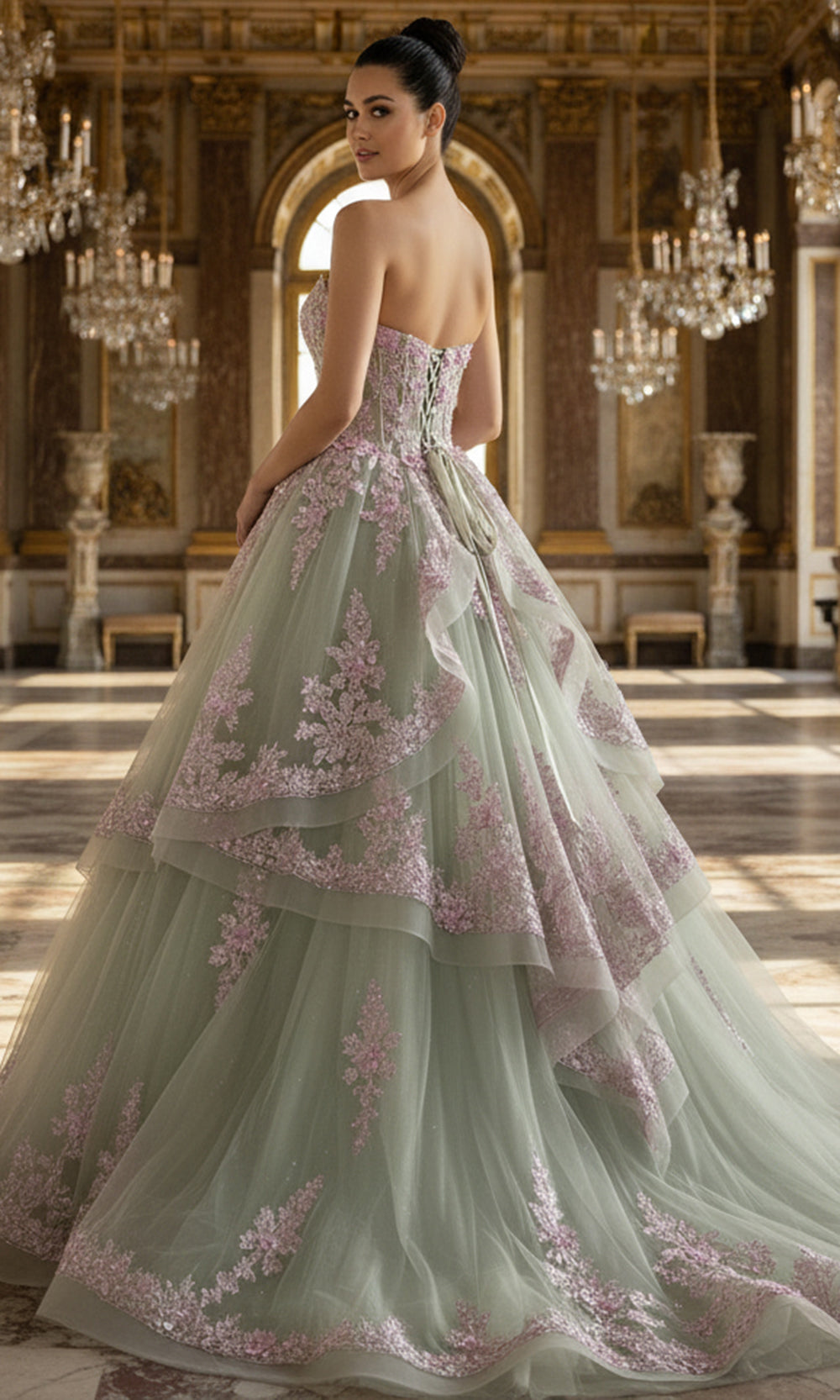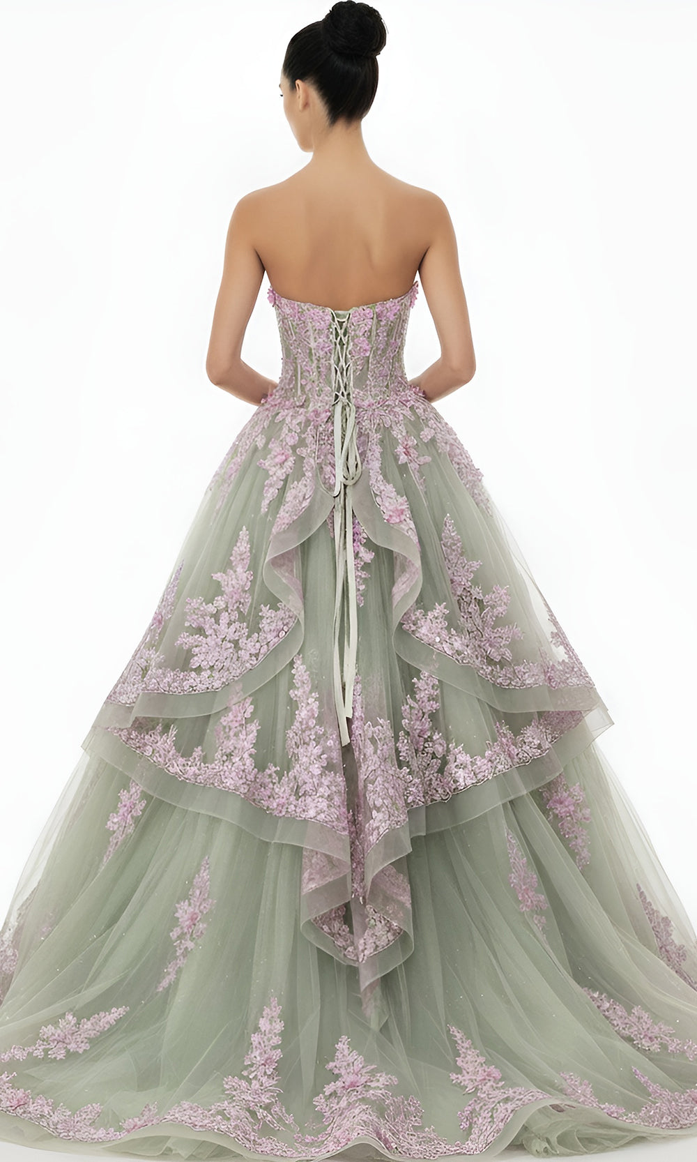 | Details: | Illusion Corset Bodice, Strapless, Floral Appliques, Lace -Up Back, Layered Tiered Skirt |