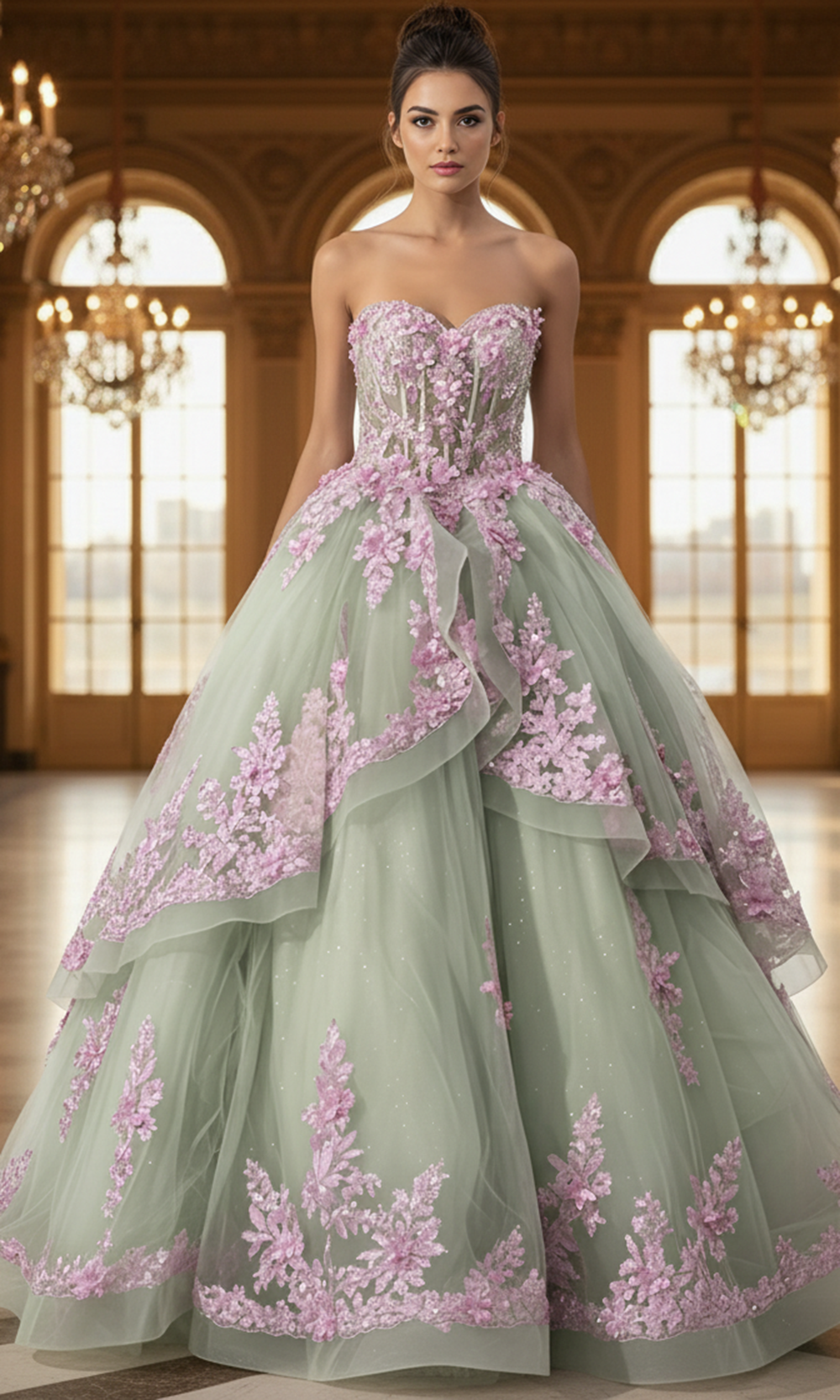 Captivating layers and exquisite accents shape the visual story of the Jovani Q45685 gown. This strapless creation features an illusion corset-style bodice that delivers striking definition, while floral appliques cascade from the sweetheart neckline to the hem, giving the entire silhouette a touch of movement and dimension. The tiered ballgown skirt adds volume with a sweeping finish that complements the refined detailing on the bodice. Each detail is thoughtfully placed, adding to its fairytale-like charm. Showcase your most memorable moments with the enthralling Jovani Q45685, where timeless beauty meets romantic artistry. Model is wearing Sage/Lilac color.