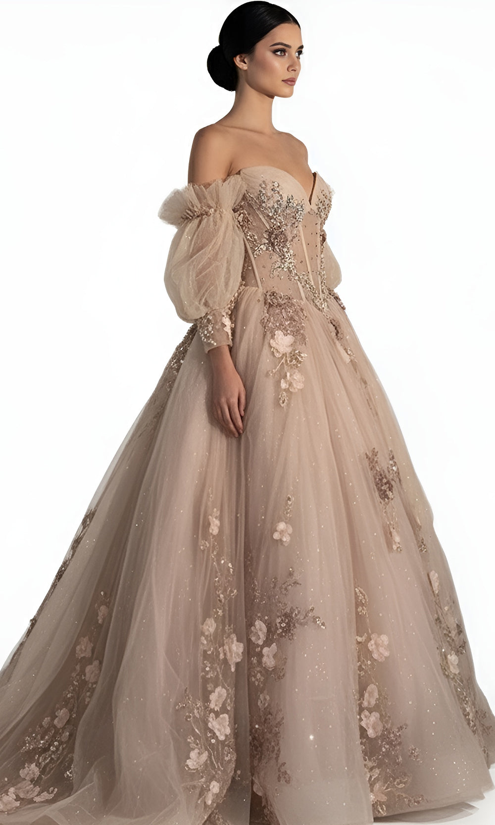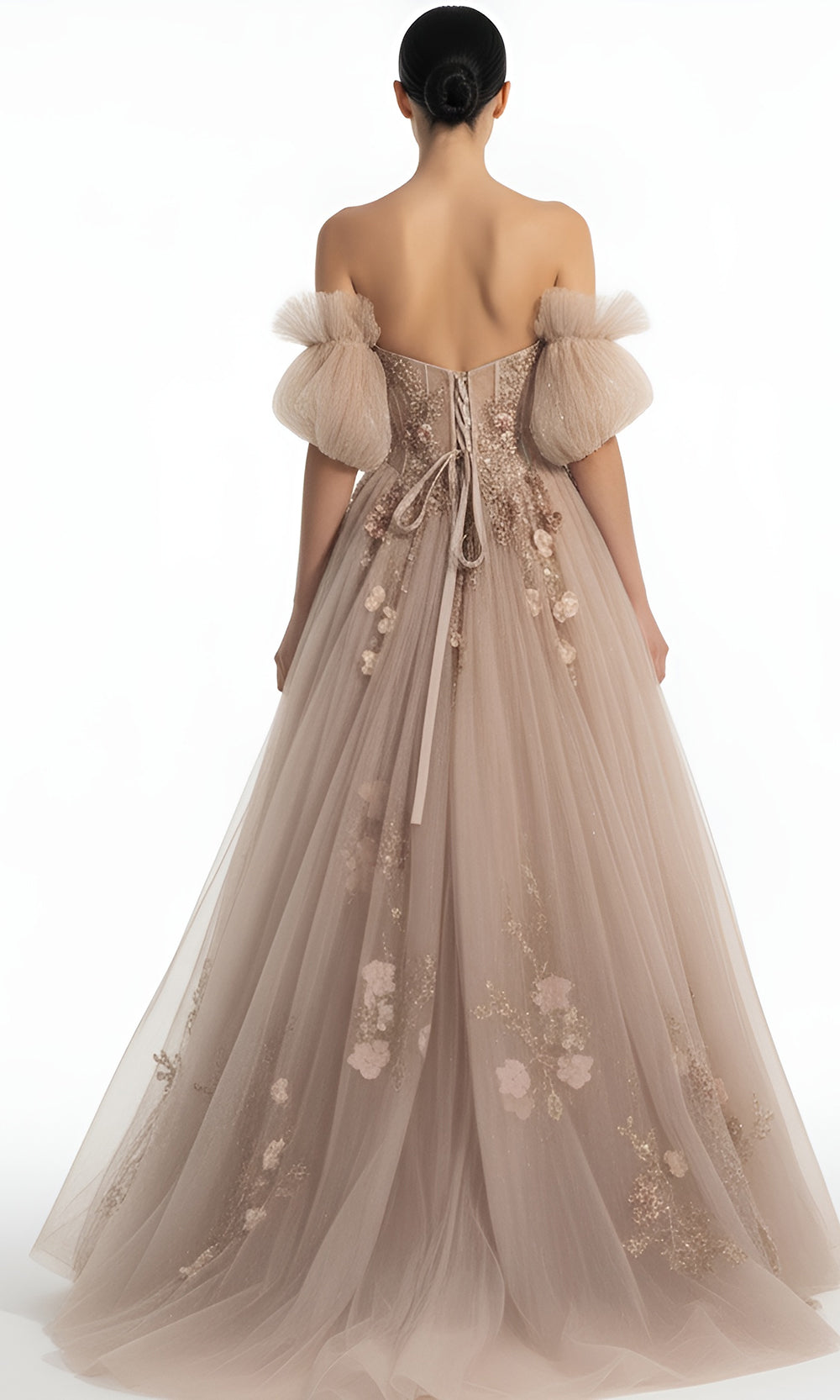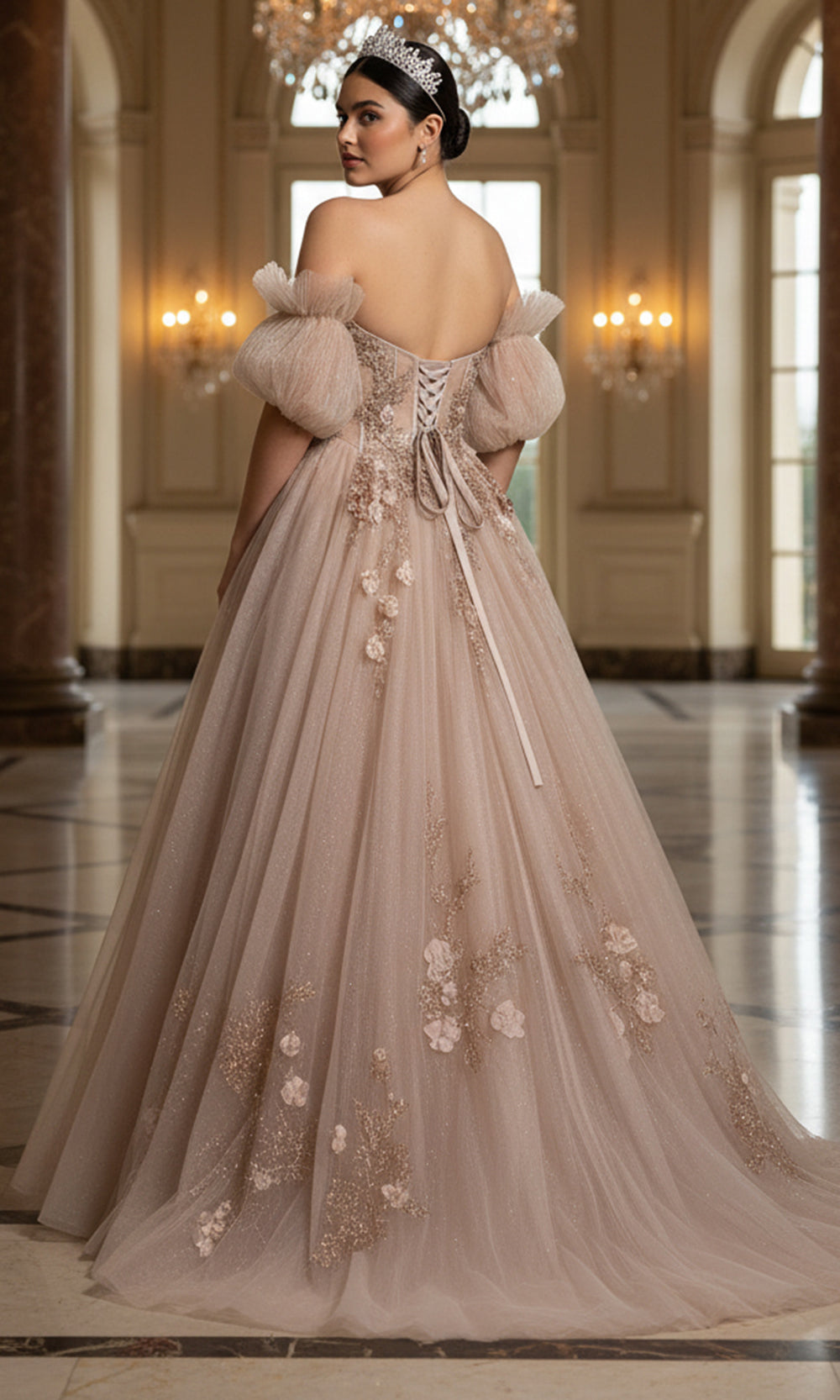 | Details: | Off Shoulder Puff Sleeves, Sheer Corset Bodice, 3D Florals, Embroidery, Lace-Up Closure |