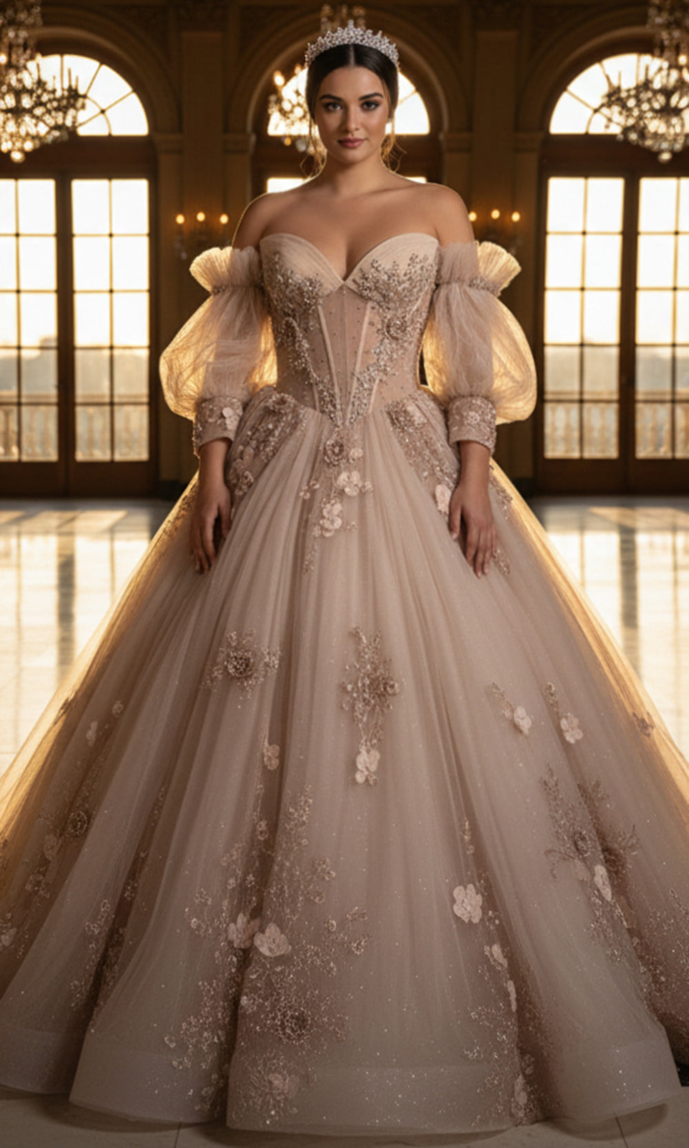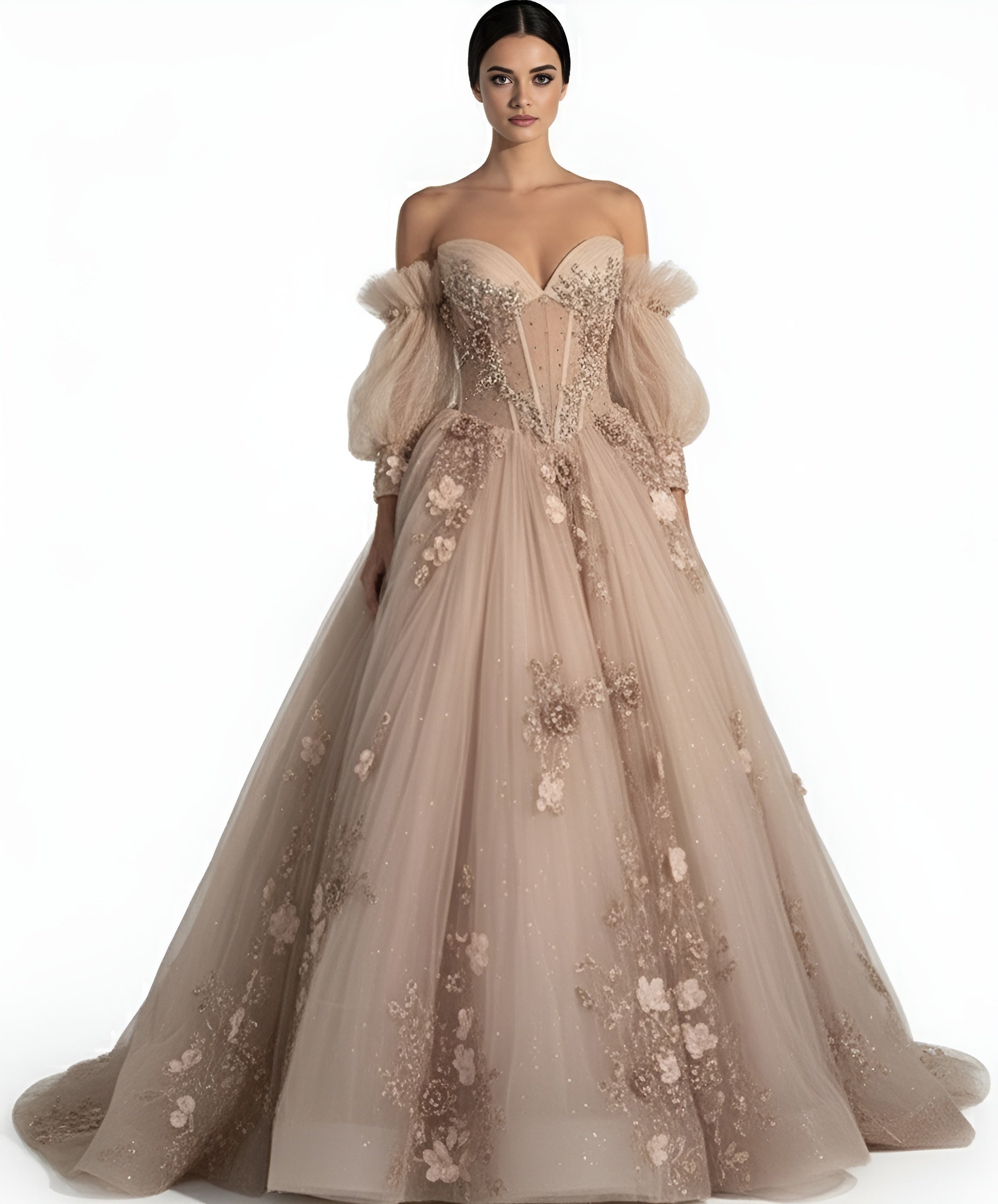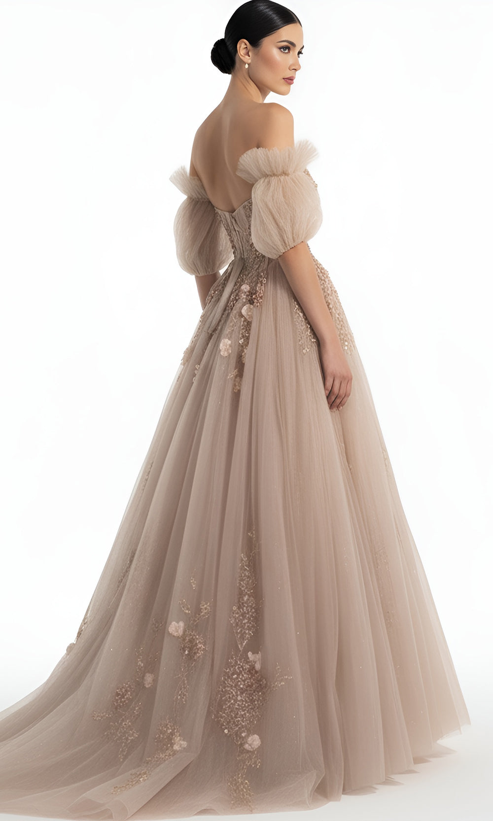 | Details: | Off Shoulder Puff Sleeves, Sheer Corset Bodice, 3D Florals, Embroidery, Lace-Up Closure |