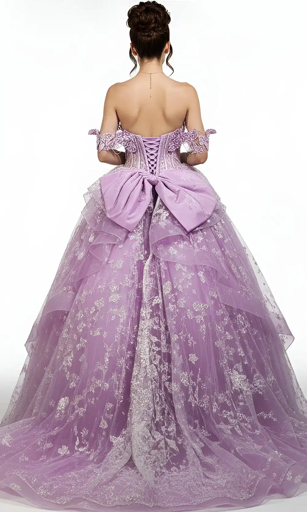 The Jovani Q48441 ballgown exudes storybook beauty, creating a scene of pure enchantment. It features a structured sheer bodice with a sweetheart neckline and off shoulder sleeves that bring attention to the collarbone without overwhelming the silhouette. The bodice is adorned with sparkling silver floral appliques that cascade onto the voluminous tulle skirt, blending texture and dimension. The majestic sweep train and oversized bow back enhances the dramatic appeal. The Jovani Q48441 style is an enchanting choice for any grand celebration. Model is wearing Lilac color.