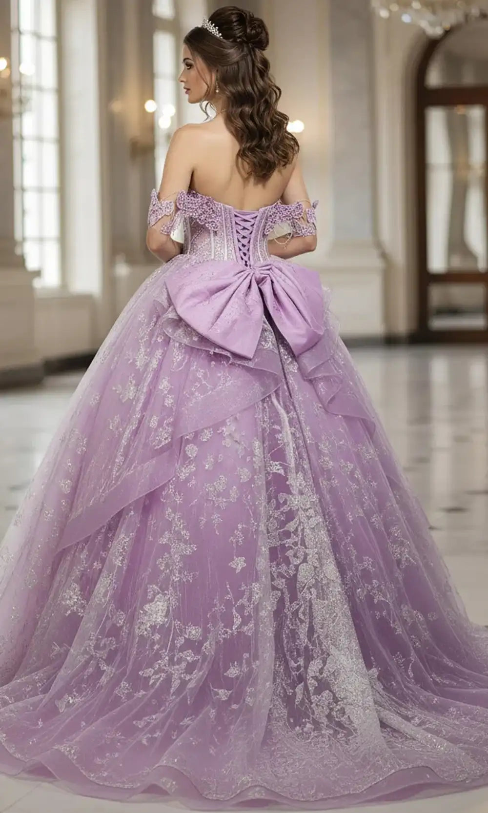 | Details: | Off Shoulder Sleeves, Illusion Corset Bodice, Floral Appliques, Scallop Hem, Bow Accent, Lace-Up Back |
