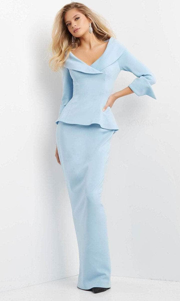 Trailing with sculpting seams on a luxe fabric, this gown parades a portrait neckline with a shawl collar and cuffed quarter sleeves. Detailed with a full back and a high low peplum accent, the sheath skirt opens with a back slit as it touches the floor with its hem. Model is wearing the Light Blue color.