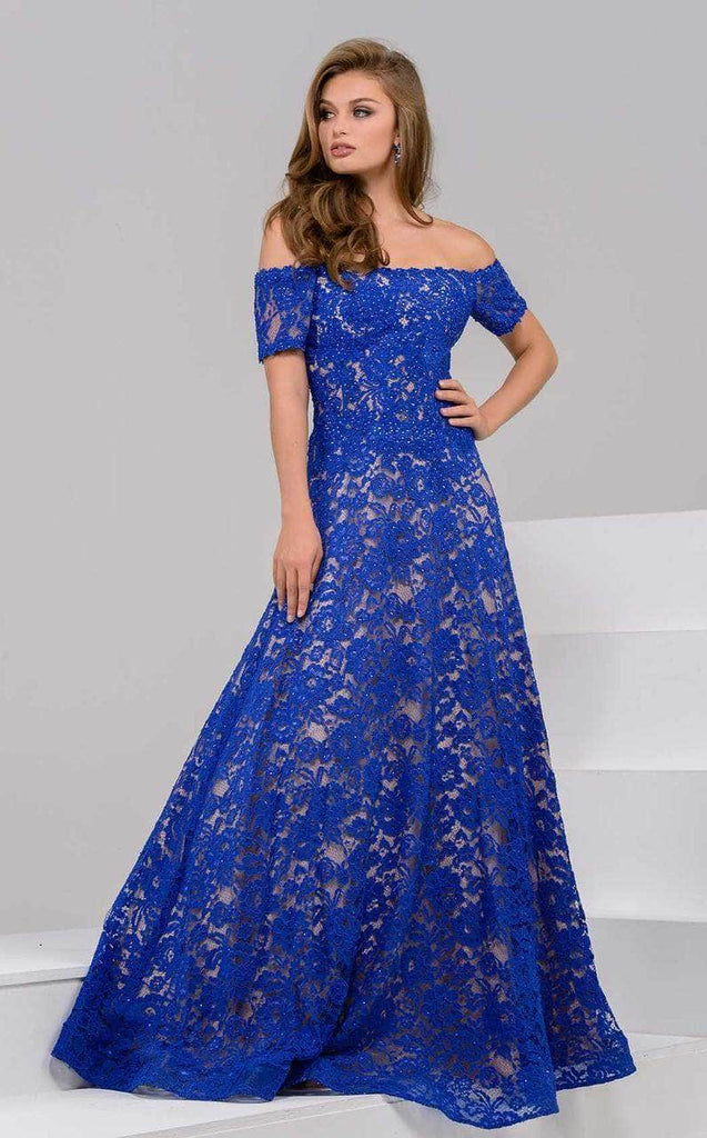 This style highlights an off-the-shoulder neckline and sleeves with a fitted bodice. The nipped waist gives way to a pronounced Ballgown skirt. This gown finishes with a full length hem. Rich lace fabric fashions gorgeous texture throughout. Model is wearing the Royal color.