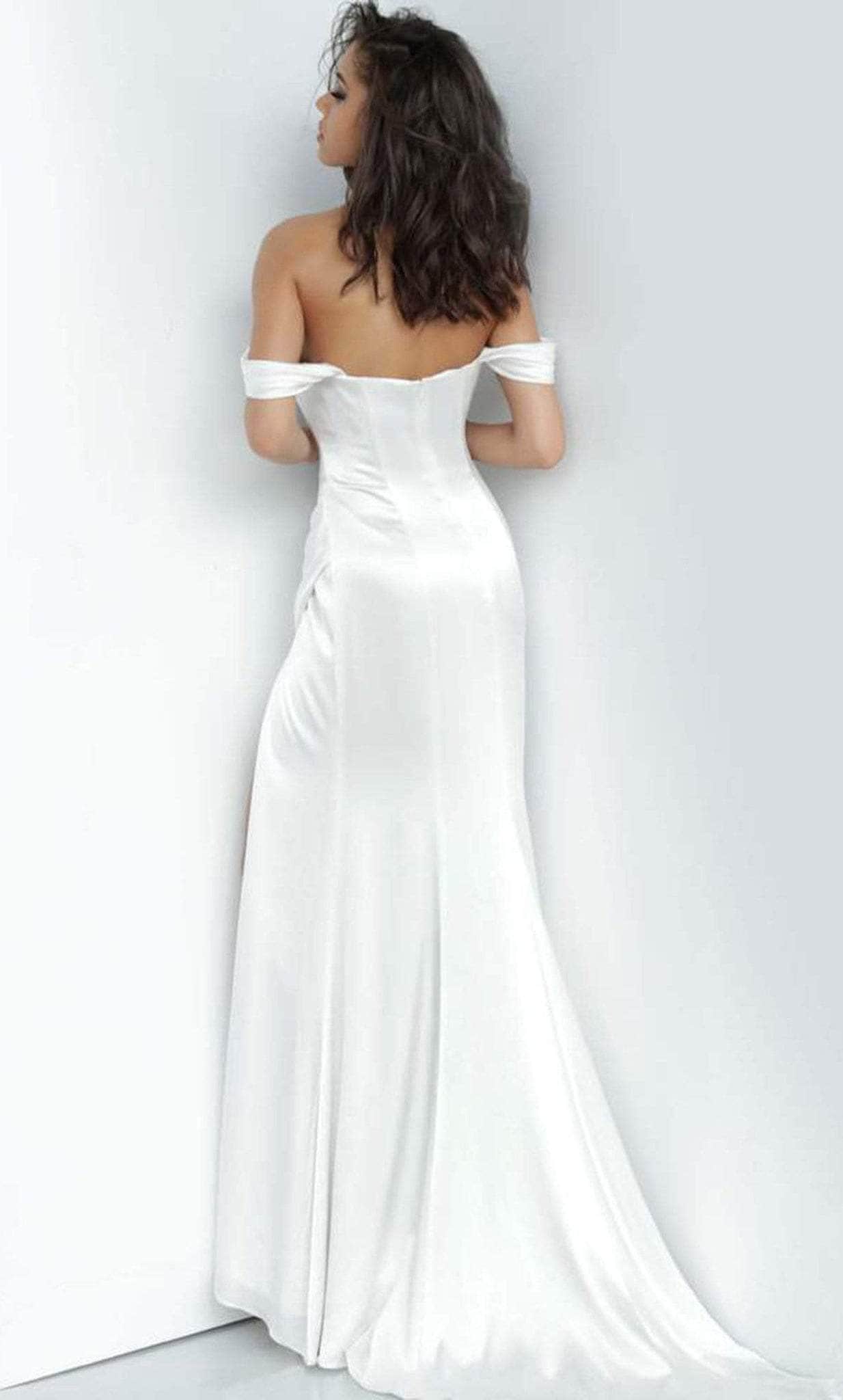 Boating of a subtly ruched drape in rich satin, this gown renders an off-the-shoulder neckline and a mid-open back. Lavishly molding those refined assets, the sheath skirt parts with a thigh-high slit as it touches the floor with a sweep of train. Model is wearing the Off White color.