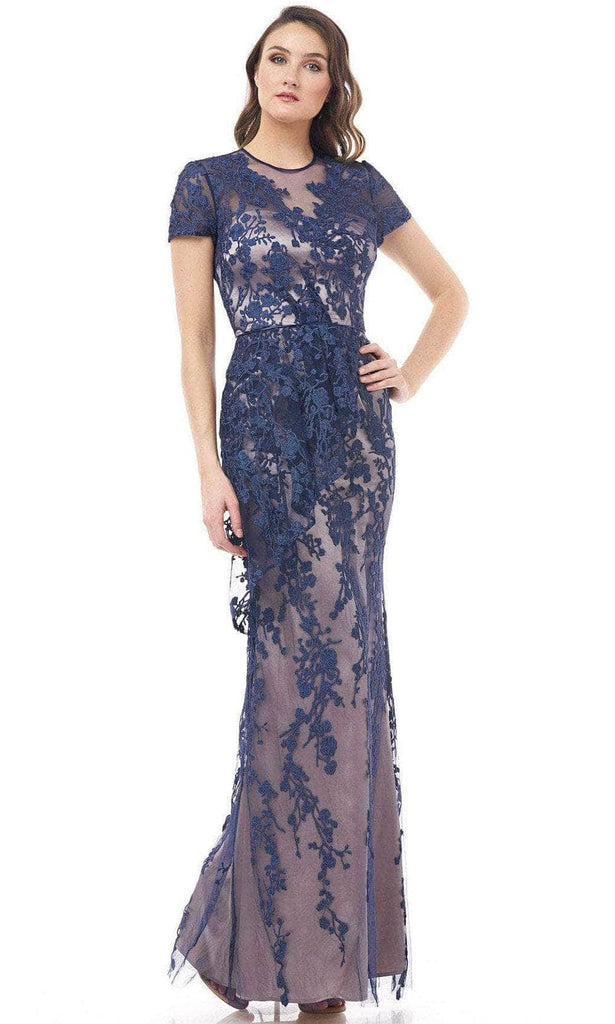 Dress to the nines in this gorgeous JS Collections 866938. This gown has an illusion jewel neckline and short sleeves in beautiful trailing floral lace pattern overlay. The lining in soft satin fabric has a scoop neckline and an alluring mid-cut back. The sheath skirt is finished with an elegant full-length with a little bit of overskirt draping on one side of the hips for an added style. Increase your attractiveness as you appear in this JS Collections design. Couture Candy is committed to provide the very best when it comes to dresses for every occasion, and we are delighted to have JS Collections on our side to aid us in delivering exquisite dresses for various occasions that are sure to make heads turn. Model is wearing Navy Nude color.