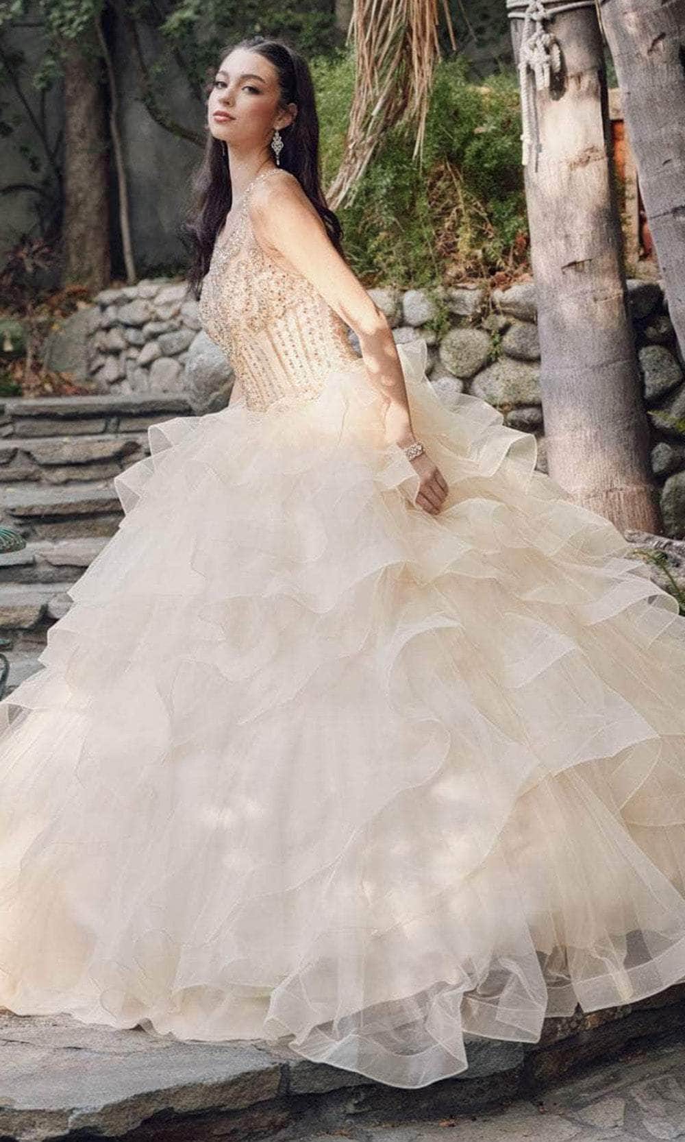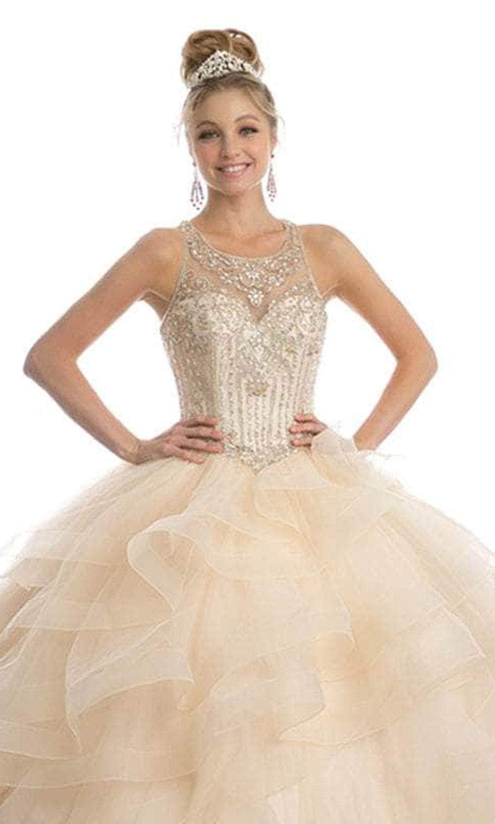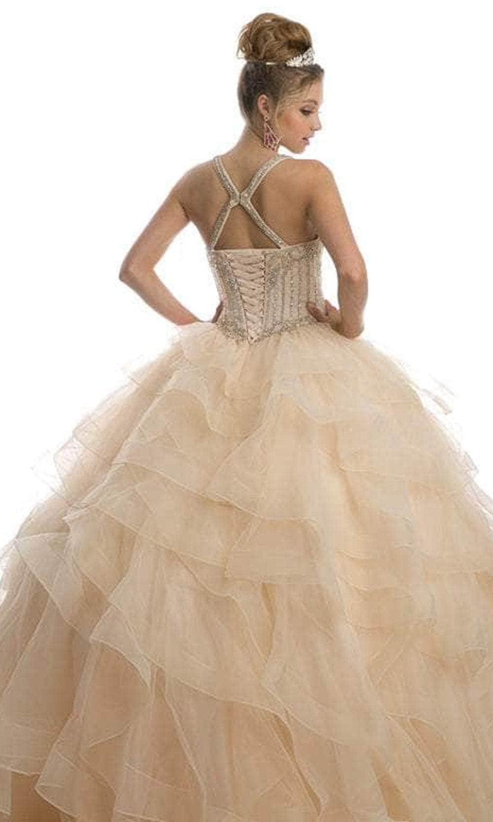 Make an unforgettable impact by donning the Juliet Dresses 1423. This sleeveless ensemble is embellished with fascinating crystal beadwork on the top bodice. The illusion scoop neckline and sweetheart lining enhance the gown alluring appeal. With a crisscross design and lace-up closure in the midrise back, you can customize the fit to perfection. The tiered ruffles and horsehair hem on the ballgown skirt add volume and glamour. Finished with a sweeping train. Draw out the princess in you with this Juliet Dresses 1423. Model is wearing Champagne color.