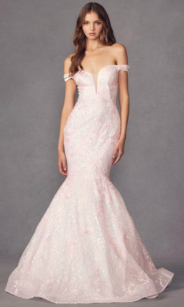 Go beyond beauty in a galactic Juliet Dresses 2412 evening dress. This embellished dress showcases a plunging V-neckline with a sheer inset and off-shoulder sleeves. The back shows an open back with lace up closure, while the skirt, being enclosed by a back zipper, exhibits a mermaid silhouette down to its full length, also having a sweep train. Get on the best-dressed lists in this Juliet Dresses 2412 creation. Models are wearing the Blush, Lilac, and Mint colors.