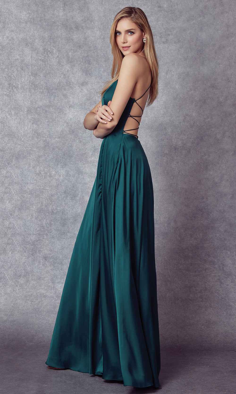 | Details: | Spaghetti Straps, Open Lace-Up Back, Side Pockets, Flowing Skirt, High Slit |