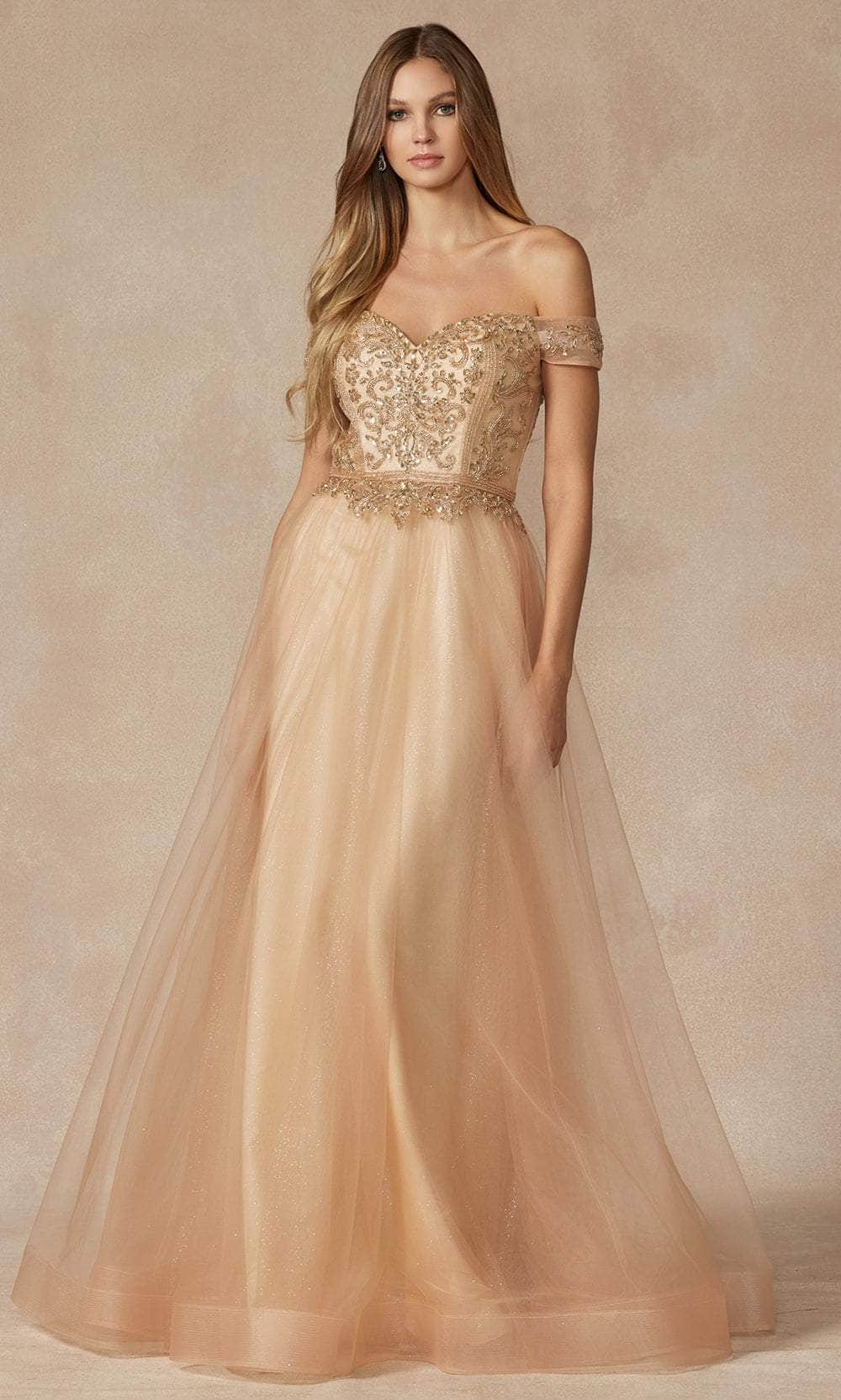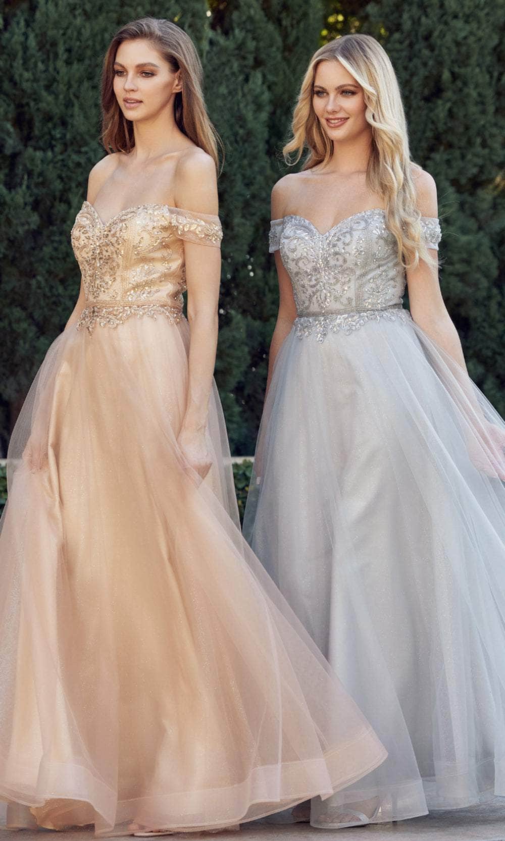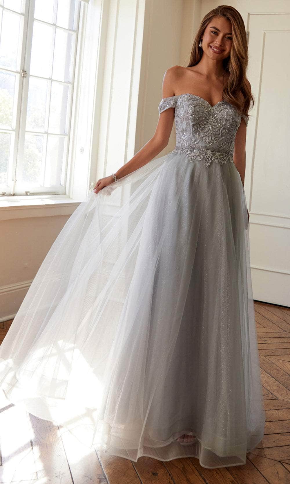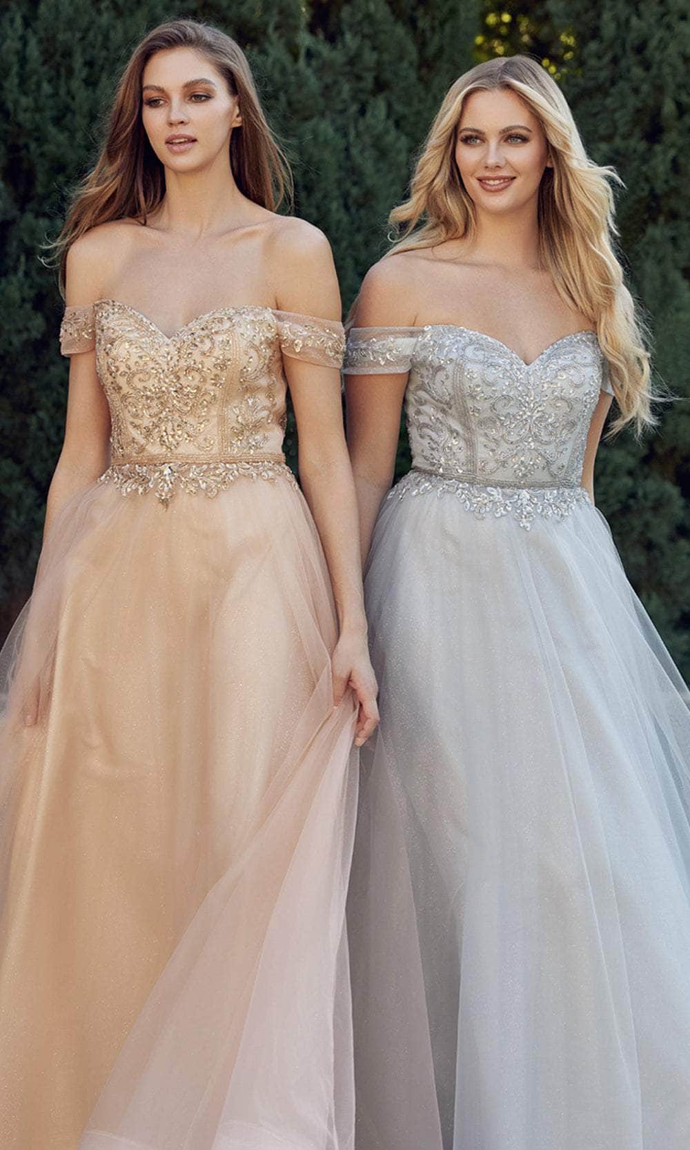 Radiate timeless elegance with the Juliet Dresses 287, an exquisite gown designed for graceful sophistication. The sweetheart neckline and off-shoulder cap sleeves add a touch of romance. Intricate glitter embellishments and floral details shimmer beautifully, creating a luminous effect under the lights. The beaded waist detail enhances the silhouette before flowing into a soft tulle A-line skirt, delivering an effortlessly regal appearance. Whether for a ball, wedding, or formal celebration, the Juliet Dresses 287 is a vision of refined beauty. Models are wearing Gold, and Silver colors.