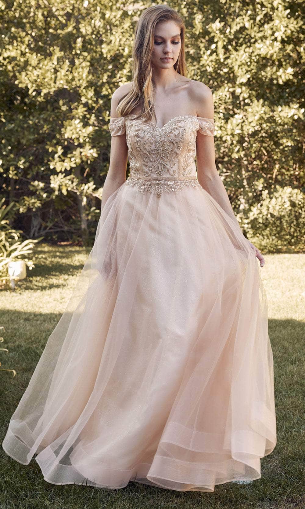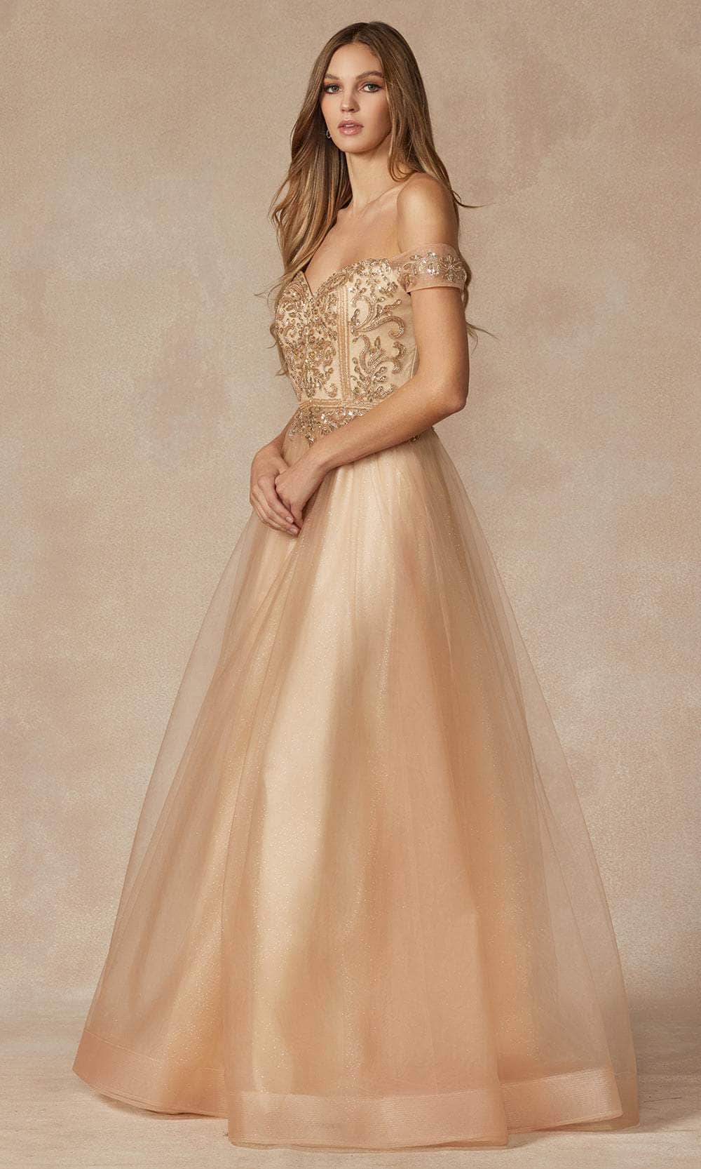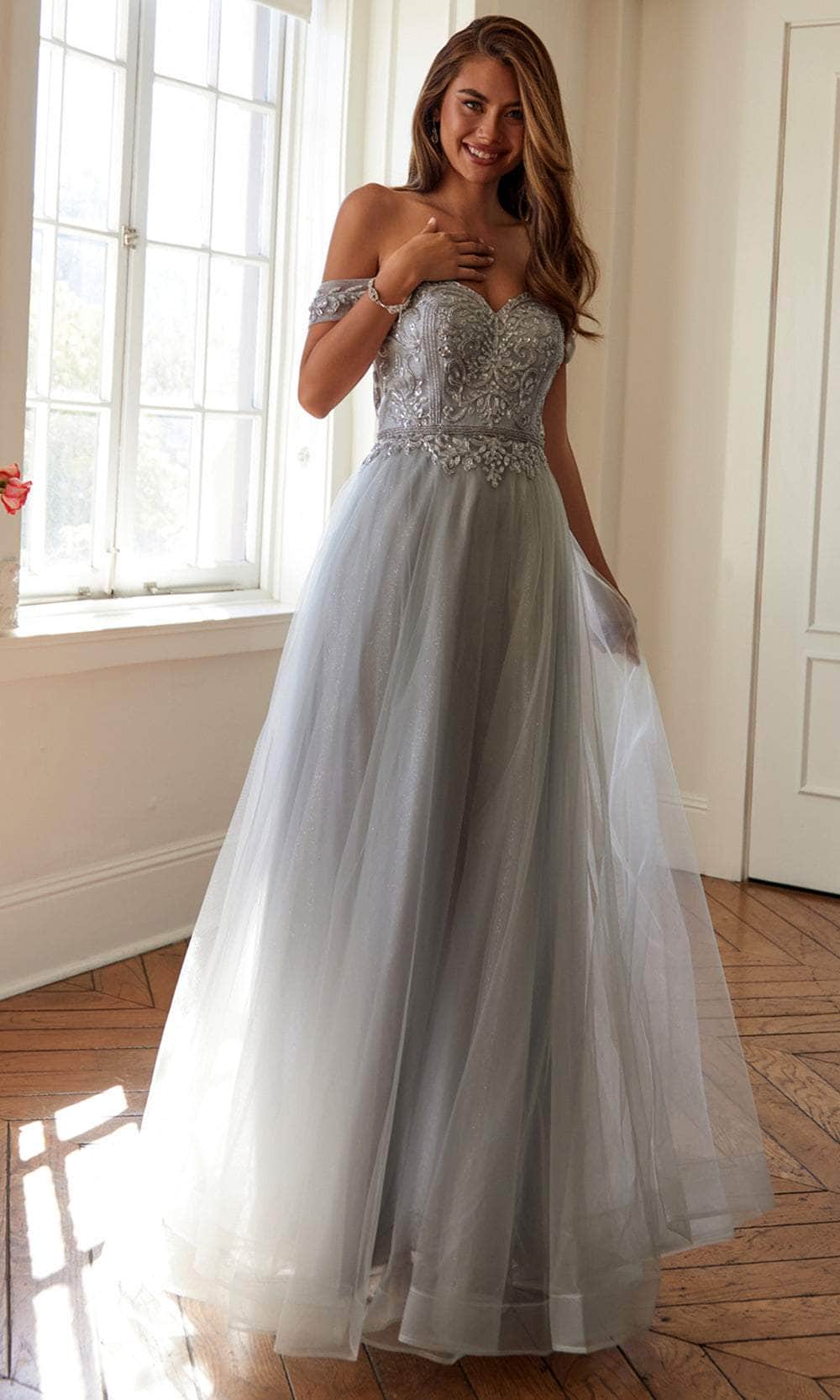Radiate timeless elegance with the Juliet Dresses 287, an exquisite gown designed for graceful sophistication. The sweetheart neckline and off-shoulder cap sleeves add a touch of romance. Intricate glitter embellishments and floral details shimmer beautifully, creating a luminous effect under the lights. The beaded waist detail enhances the silhouette before flowing into a soft tulle A-line skirt, delivering an effortlessly regal appearance. Whether for a ball, wedding, or formal celebration, the Juliet Dresses 287 is a vision of refined beauty. Models are wearing Gold, and Silver colors.