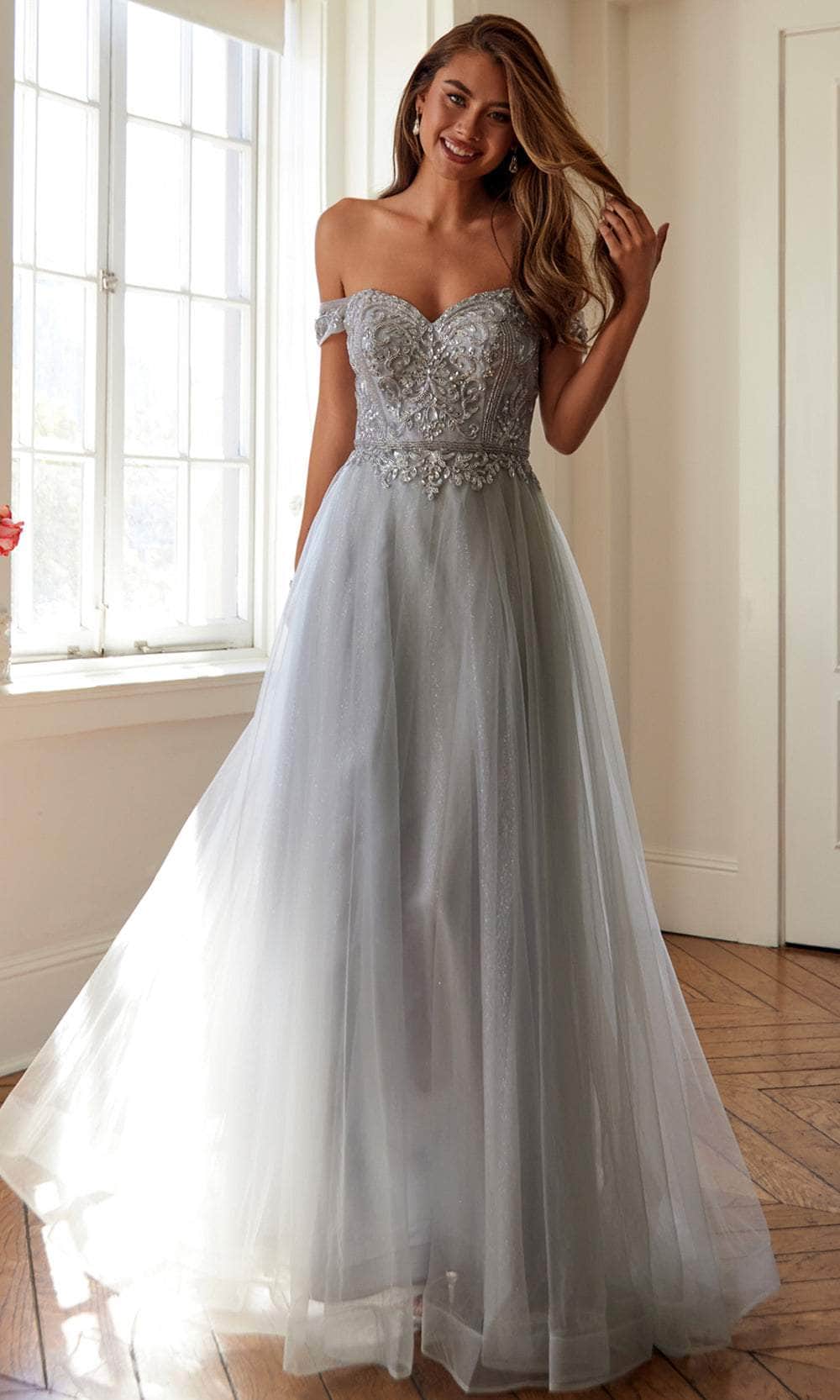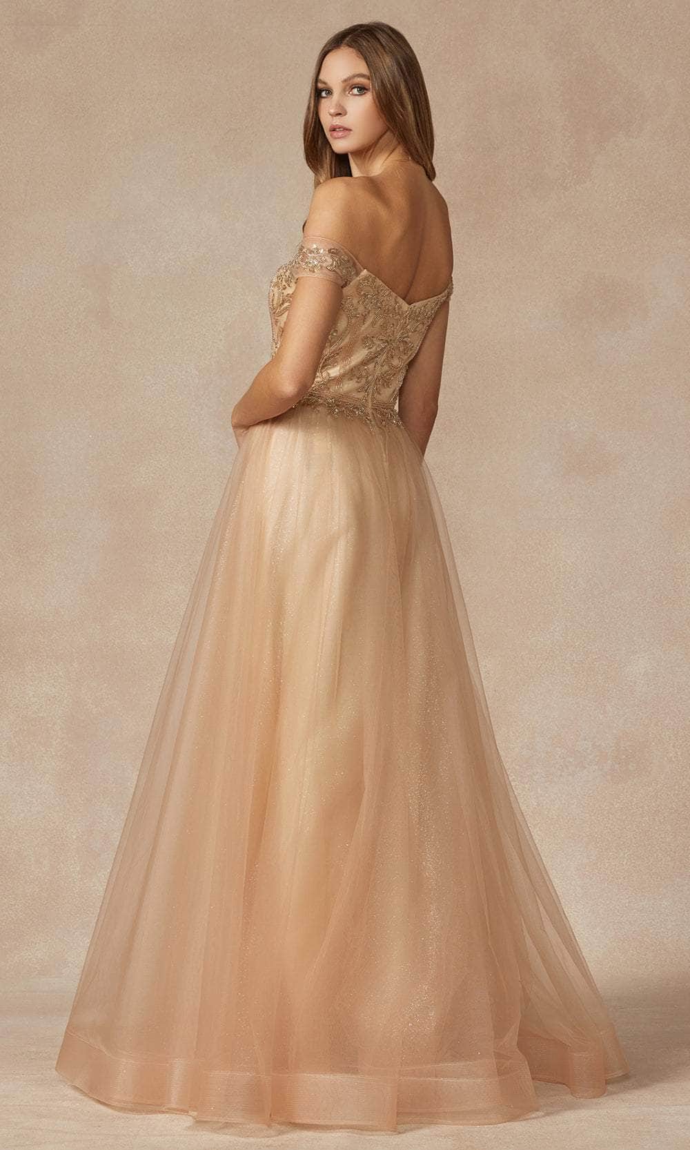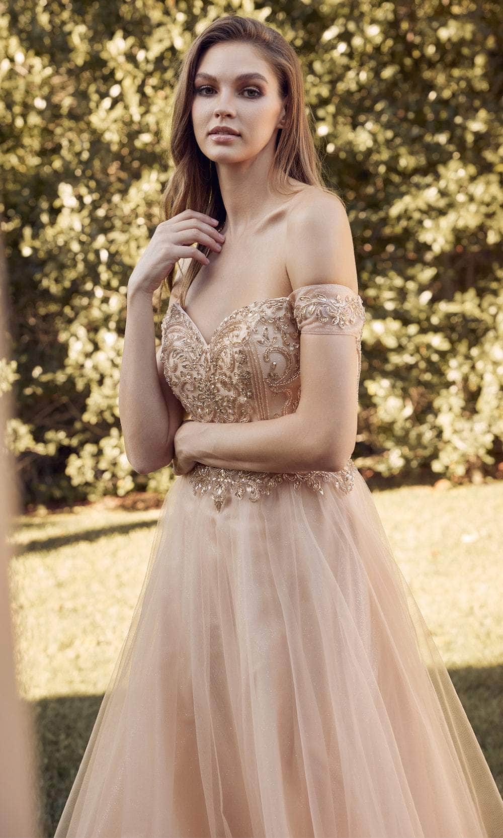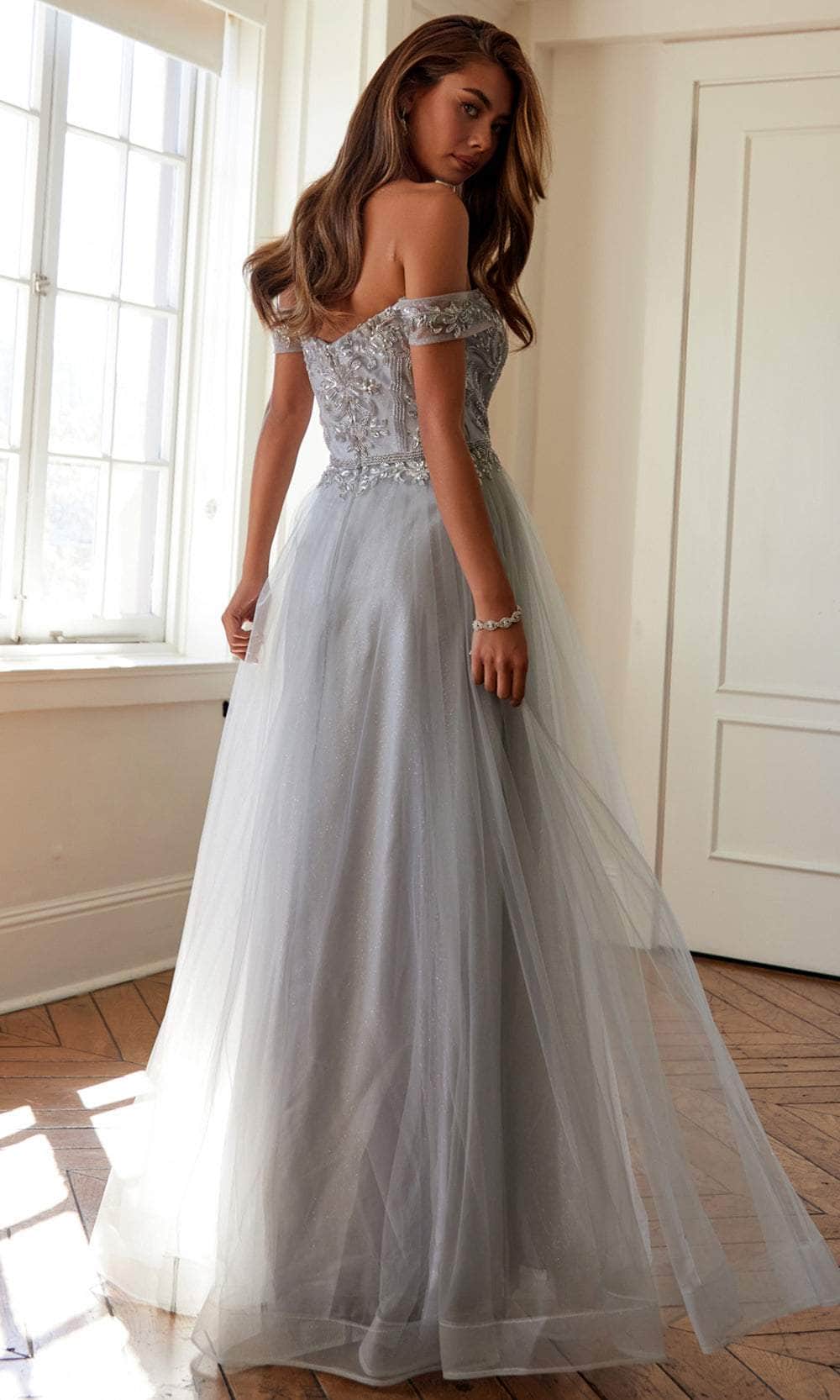 Radiate timeless elegance with the Juliet Dresses 287, an exquisite gown designed for graceful sophistication. The sweetheart neckline and off-shoulder cap sleeves add a touch of romance. Intricate glitter embellishments and floral details shimmer beautifully, creating a luminous effect under the lights. The beaded waist detail enhances the silhouette before flowing into a soft tulle A-line skirt, delivering an effortlessly regal appearance. Whether for a ball, wedding, or formal celebration, the Juliet Dresses 287 is a vision of refined beauty. Models are wearing Gold, and Silver colors.